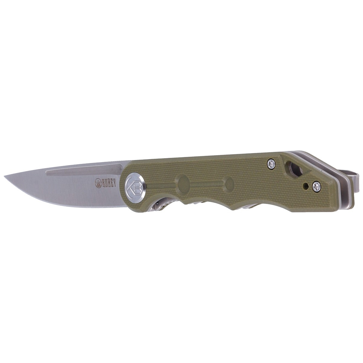 Handle - green G10 (pressure-pressed fiberglass with synthetic resin) facings,textured for improved grip security, bolted to the knife's steel frame. The so-called open-backed design without the typical backspacer, fastened together with steel spacers for easy cleaning. The simple, solid construction gives you the assurance of many years of use. Fore finger groove improves grip security. The pivot axis is decorated with a stylized manufacturer's logo. A two-position (right and left) metal deep carry clip allows you to carry the knife discreetly in your pocket in tip-up position (blade tip up). Above the clip a lanyard hole, a hole for threading a safety or decorative cord.