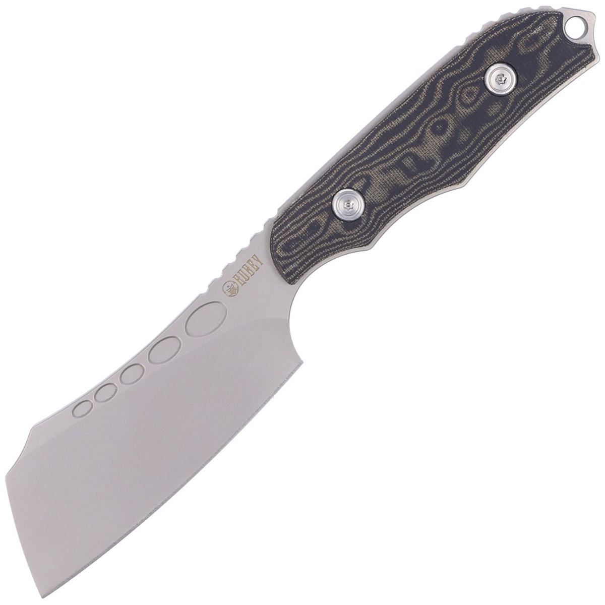 Blade - wide with a Cleaver (chopper) shape and a thickness of 4.0 mm with a clearly marked belly of the cutting edge. Plain blade derived with Flat Grind and finished with scratch-masking and glare-eliminating Sand Blasted method. On the back of the blade upper jimping, notched thumb rest.