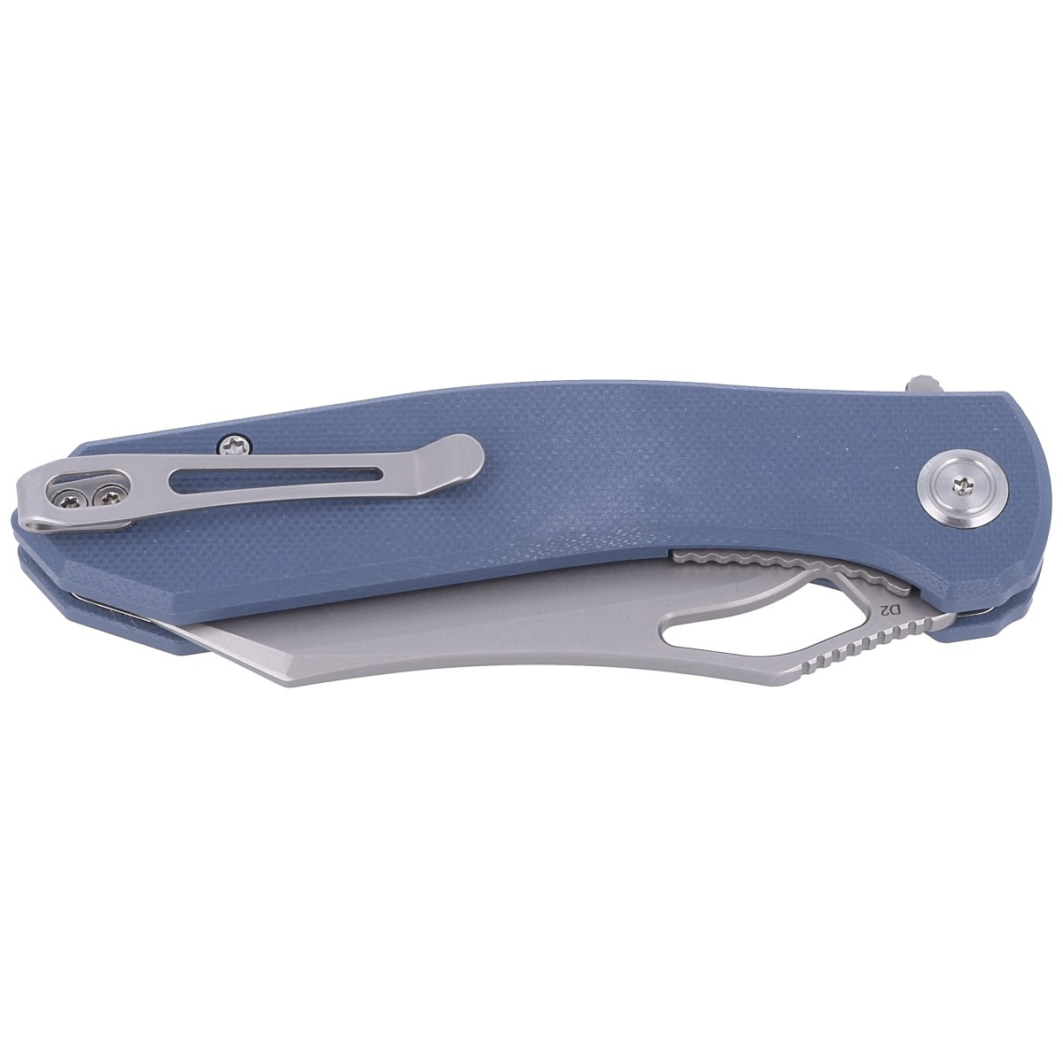 - Drake, Blue G10, Bead Blasted D2, a large, all-purpose EDC knife. Sheepsfoot head in D2 steel,, fast Flipper flipper for opening and G10 handle. Excellent value for money! Bestseller!