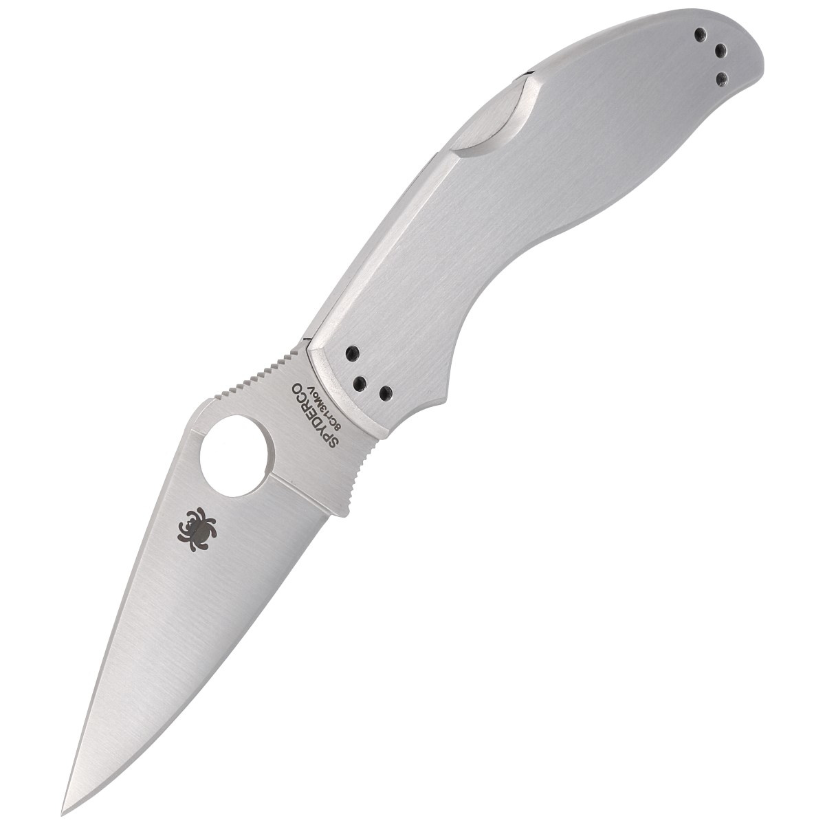 Blade - 2.5 mm thick with Leaf-Shaped profile (leaf shape). Plain blade was derived with Full Flat Grind (Full Flat Grind). The flat grind guarantees perfect geometry of the cutting edge with a sharp tip, reduces the weight of the knife and presents a beautiful satin finish. The SpyderHole circular cutout (Spyderco patent) has increased ramp support hump, which positions the thumb directly over the opening making it easier to quickly open the blade with cold or wet hands. Notched supports: the thumb ramp (spine jimping) and (finger choil jimping), an index finger undercut between the handle and the cutting edge make it easier to control the knife. Back-Lock blade lock.