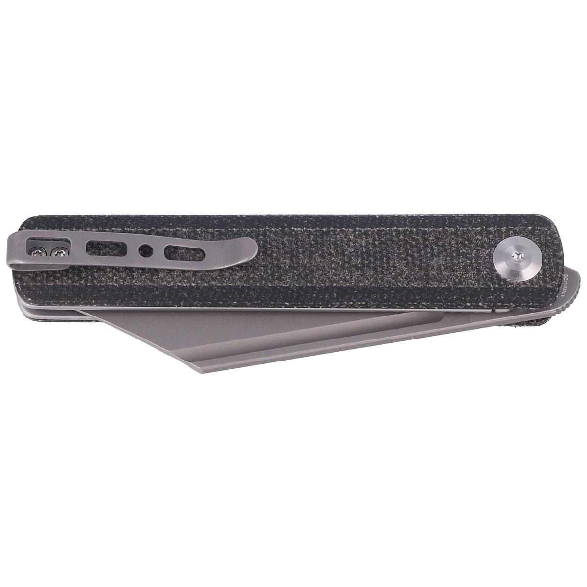 Handle - in black color. Made of micarta, a composite material of cotton or linen compressed under pressure with synthetic resin. Chamfered cover edges eliminate sharp edges for comfort and improved grip confidence. Open-backed design fixed with steel spacer sleeves reduces weight and facilitates cleaning. A two-position right/left deep carry clip allows you to carry the knife discreetly in your pocket in tip-up position (blade tip up).