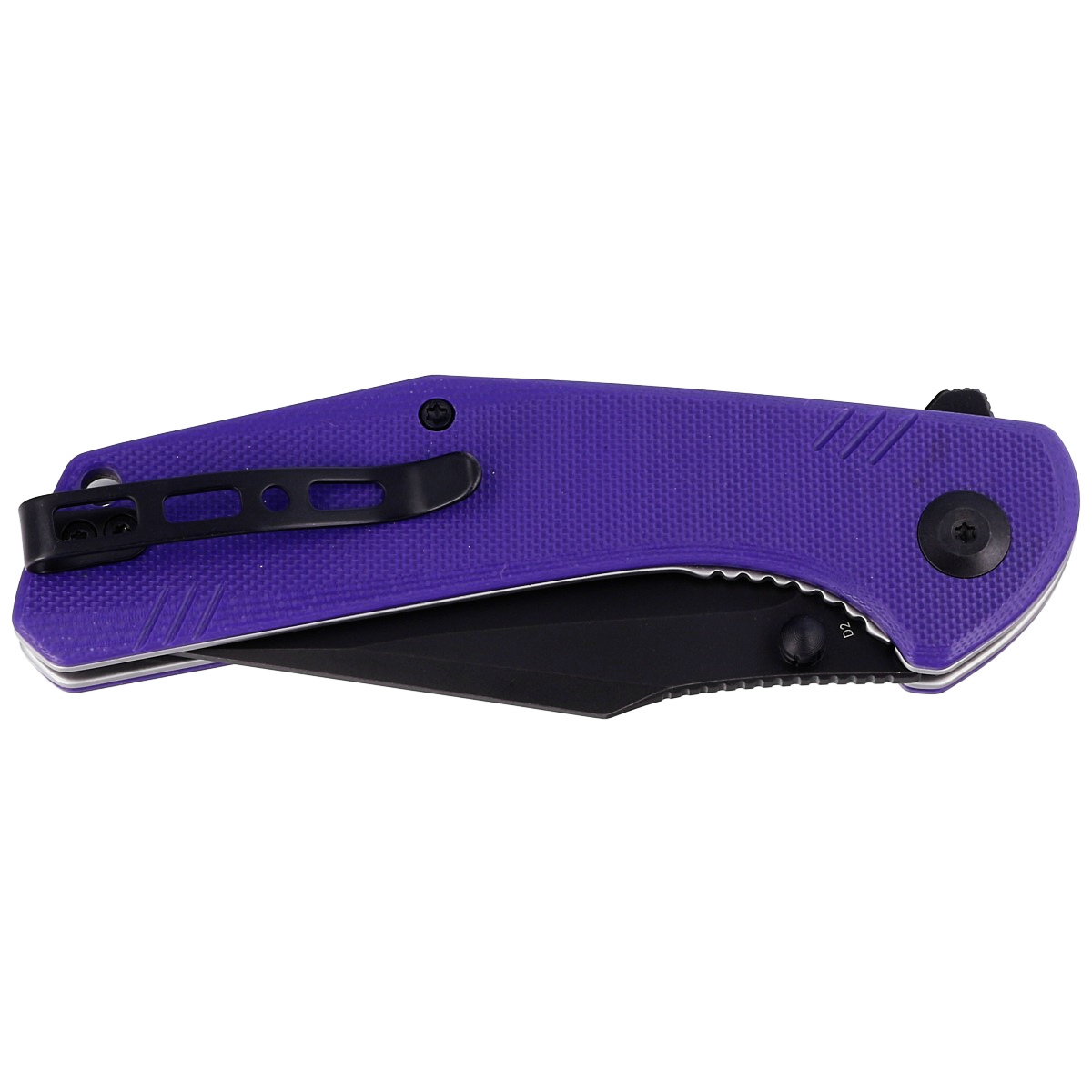 - Actium Purple G10, Black Stonewashed is a large and comfortable E.D.C. knife with a drop point blade. Made of good materials at an extremely attractive price, the folder features a D2 steel blade, reversible clip and Liner Lock. Bestseller!