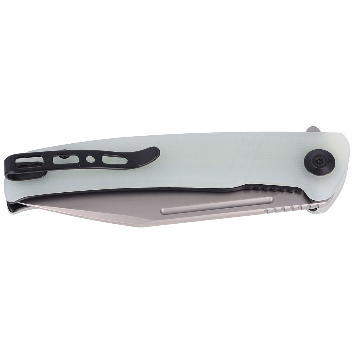Handle - made of G10, a composite fiberglass material compressed with synthetic resin. The chamfered edges of the covers eliminate sharp edges for comfort, and the jimping made at the front on the liners improves grip security. An open-backed design fixed with steel spacer sleeves reduces weight and makes cleaning easier. A two-position right/left deep carry clip allows you to carry the knife discreetly in your pocket in tip-up position (tip of the blade upward).