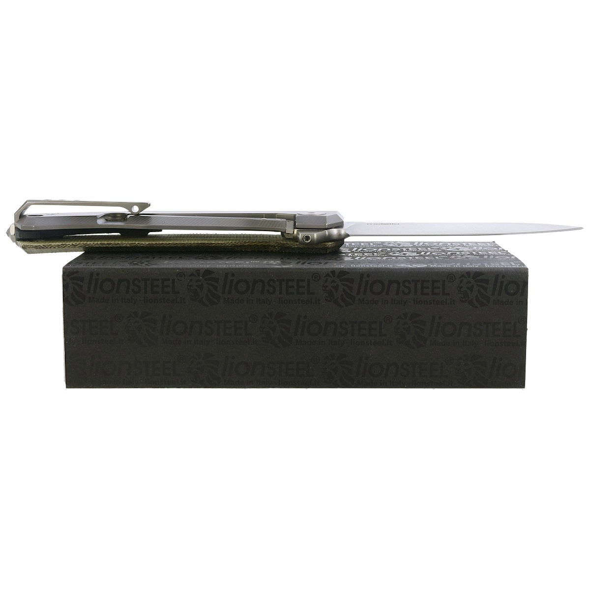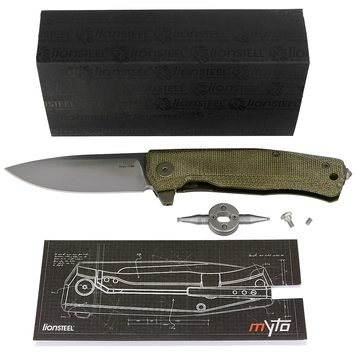 Myto Green Canvas Micarta, Satin, high-tech Hi-Tech folder with heavy-duty frame-lock. An exceptional E.D.C. knife from the Italian LionSteel manufactory. Equipped with M390 sintered steel blade, "ReF" fin on the underside of the blade, Double Crown ball bearing system and titanium clip. LionSteel Hand (#HY 68), Torx T6, Torx 8 screw adjustment wrench along with Hex wrench for glass striker screw are included.