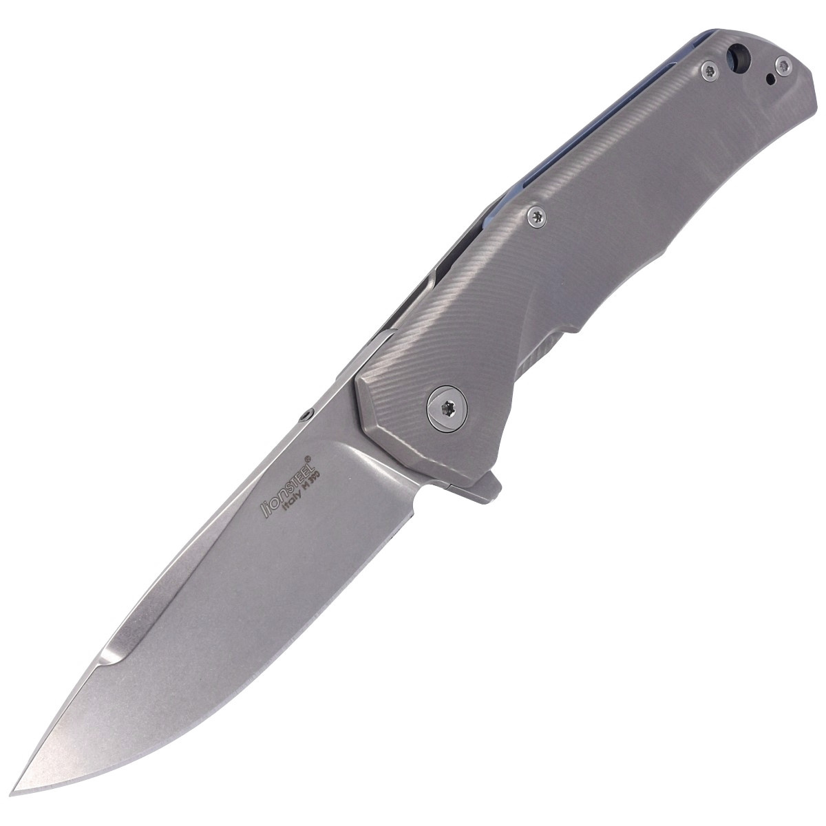 Blade - Drop Point finished in an elegant Satin method. Plain blade derived with Flat Grind which gives excellent cutting edge geometry and extreme cutting performance. Frame-Lock reinforced monolithic 6AI4V titanium blade lock, one of the grip linings acts as a locking mechanism. Located on the underside of the blade, the IKBS-assisted protrusion / flipper makes it easier to open the blade. In the open position it serves as a lower guard / hilt protecting the hand from slipping off the handle. In the upper part, the characteristic milling used to open the knife with the Flipper and Thumb Discie removed.