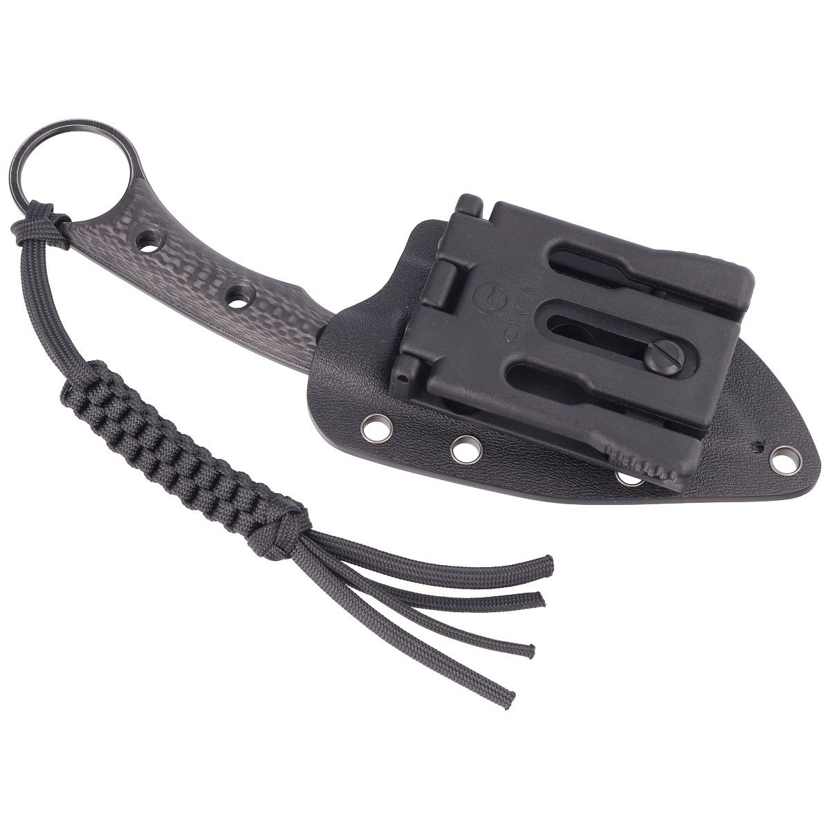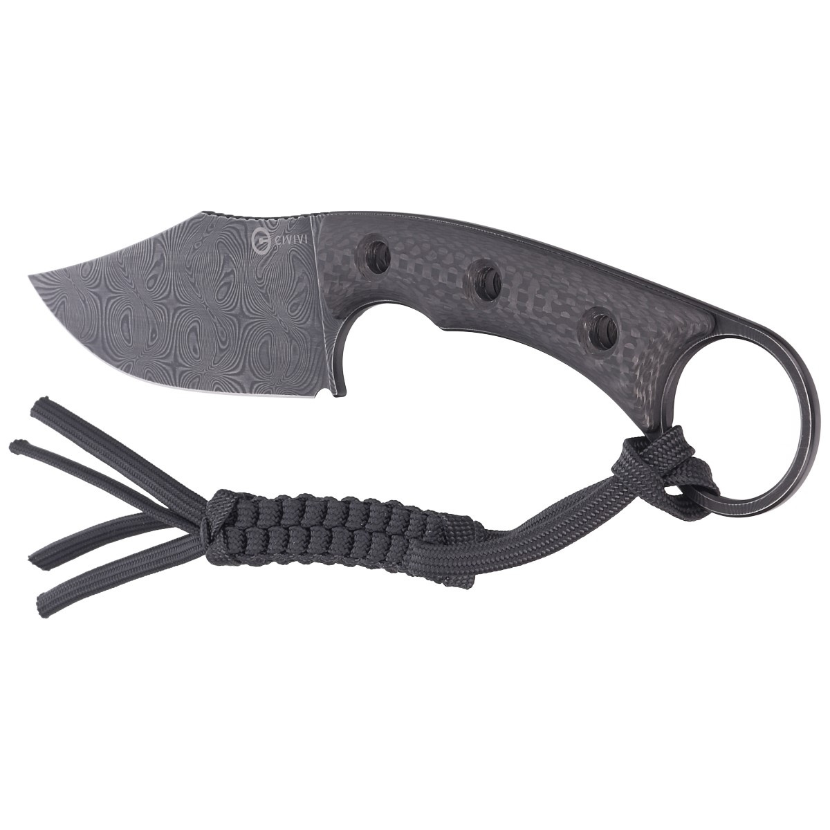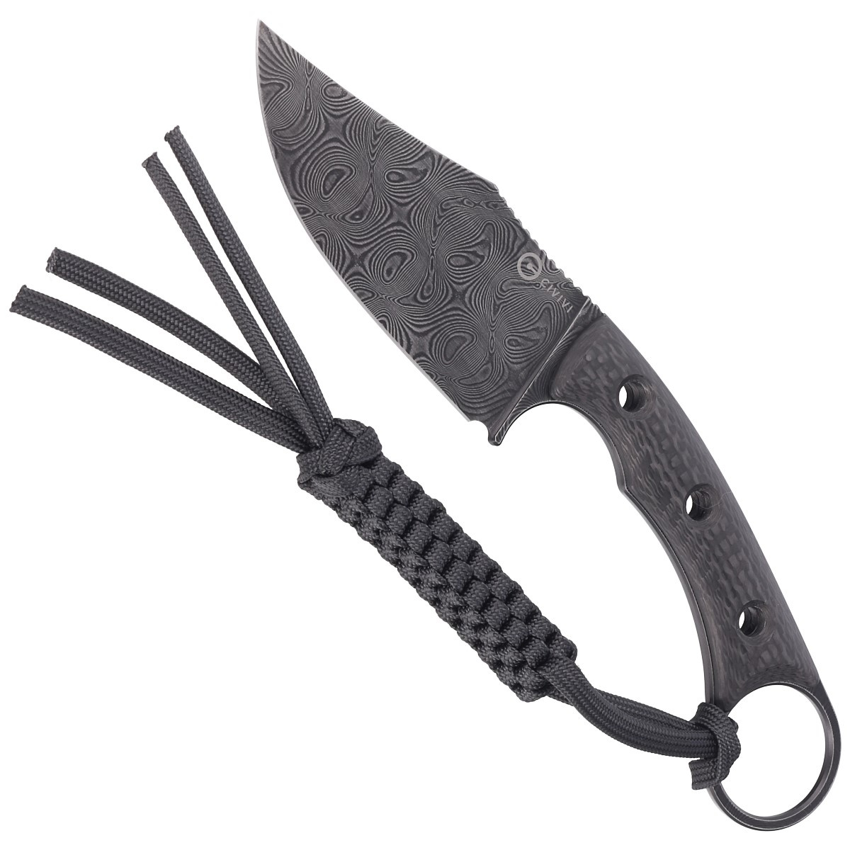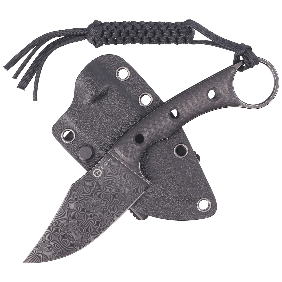 - Midwatch Carbon Fiber, Damascus, a small EDC knife with a fixed blade. A thoroughly utilitarian blade shape made of Damascus, carbon fiber handle. Kydex sheath, equipped with a T-Clip to allow attachment to a belt, decorative paracord pendant.