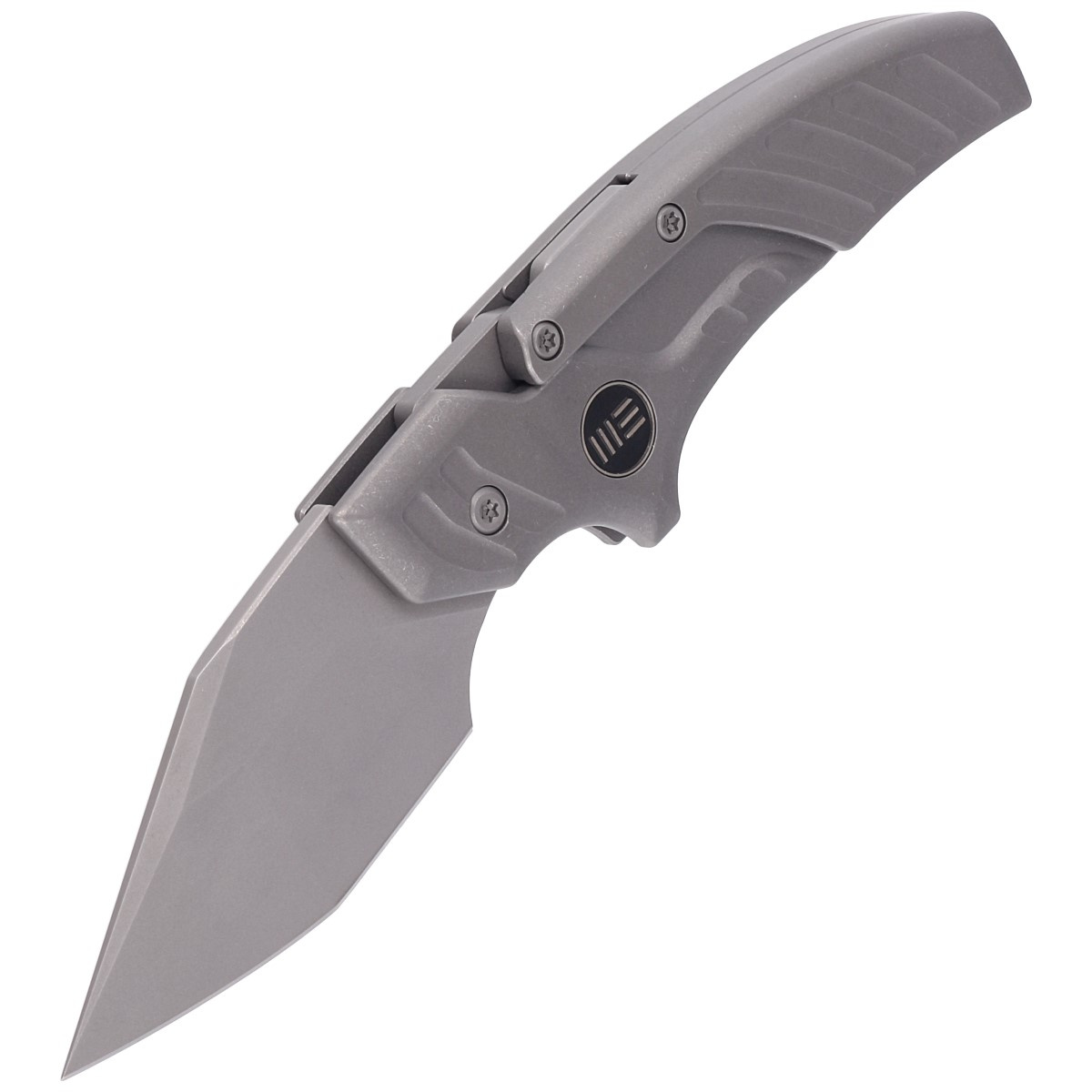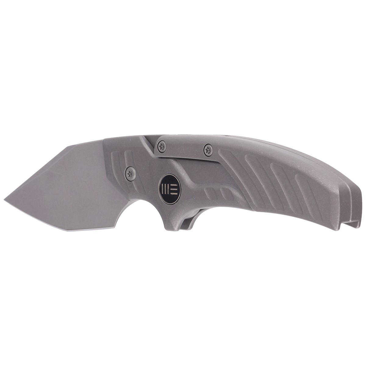 Handle - made of titanium 6AL4V, beveled edges of the covers eliminate sharp edges. Artful milling improves grip security. Sliding and pulling the handle apart allows you to quickly change the function of the knife. A fore finger groove improves grip confidence in the Fixed position, and in the Push Dagger position creates room for clenched fingers. The handle design is symmetrical which allows both right and left-handed people to use the knife without problems. The pivot is decorated with a stylized WE Knife brand logo.