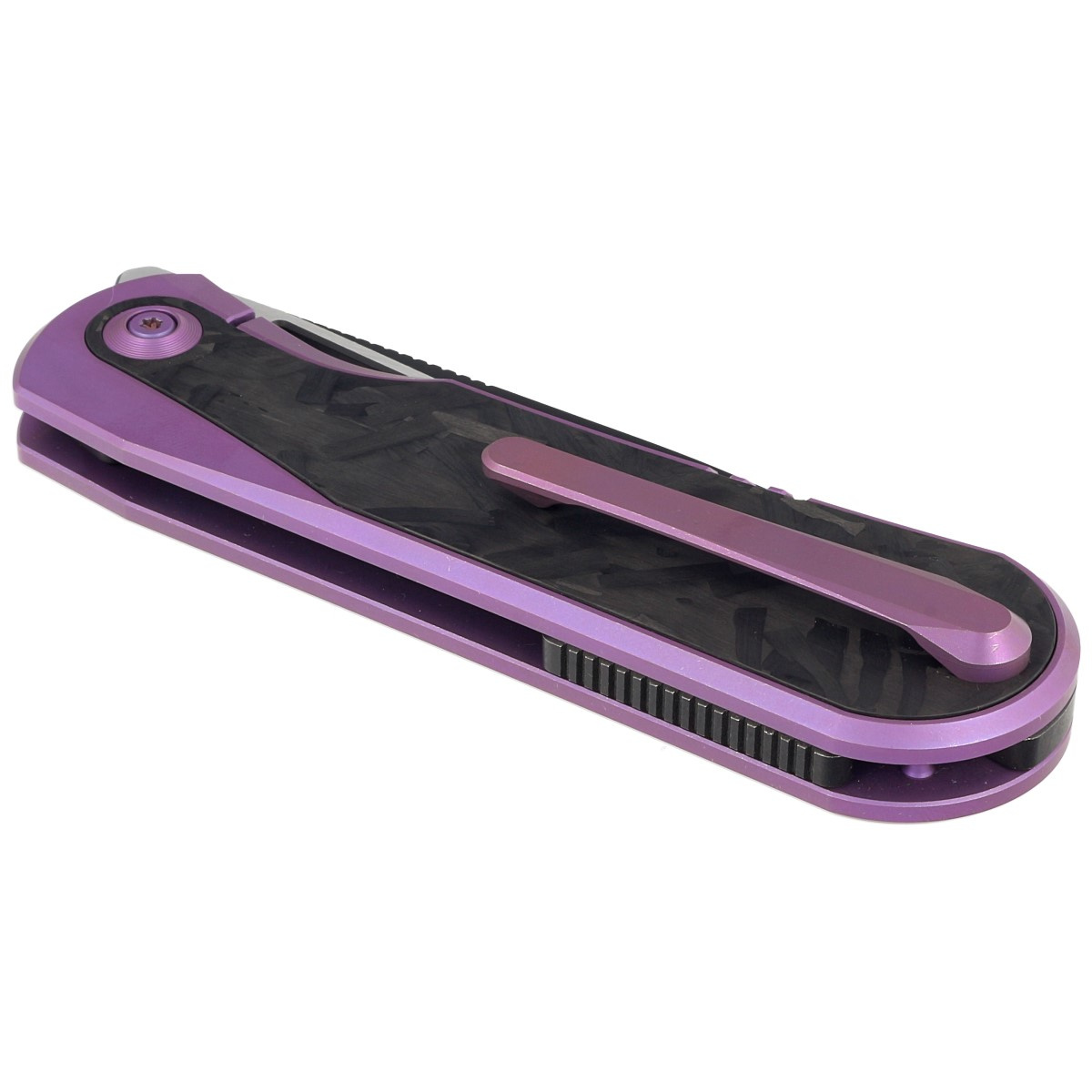 Handle - made of titanium 6AL4V anodized in purple along with a perfectly fitted liner made of Shredded Carbon Fiber. Chamfered edges of the covers eliminate sharp edges. The facings are screwed to an intricately machined titanium backspacer, giving assurance of many years of use. A fore finger groove improves grip security. The pivot is decorated with a stylized WE Knife brand logo. A single-position (right) titanium deep-carry clip allows you to carry the knife discreetly in your pocket in tip-up (blade tip up) position. On the back of the handle lanyard hole, hidden in the backspacer, a place for a decorative or security cord.