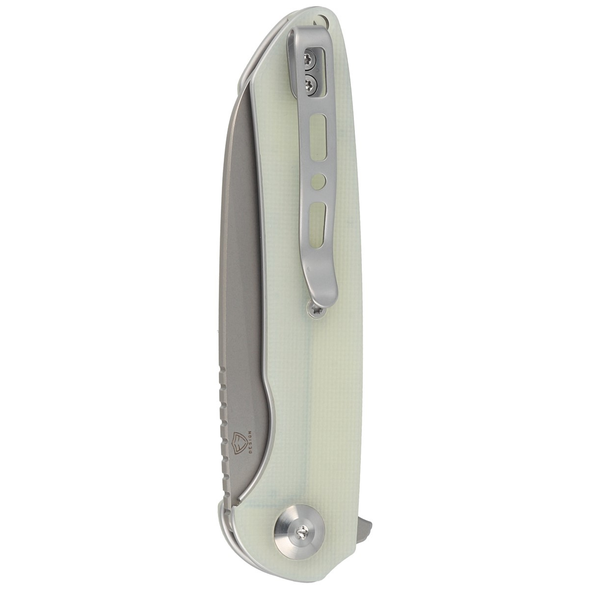 Handle - in natural color. Made of G10, a composite fiberglass material compressed under pressure with synthetic resin. Chamfered cover edges eliminate sharp edges for comfort, grip. Backspacer made of the same material as the covers. Fore finger groove made on the front improves grip security. Two-position, right/left deep carry clip allows you to carry the knife discreetly in your pocket in tip-up position (tip of the blade upward).