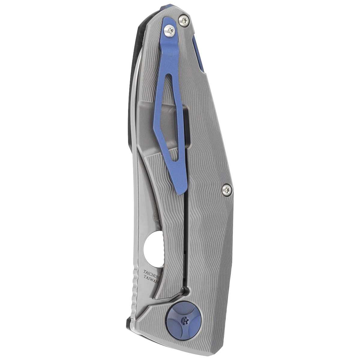 Handle - on the presentation side Carbon Fiber with a chaotic, "drunk" (Drunken) pattern. On the lock side, a solid piece of titanium covered with a delicate spider thread pattern. The facings are connected to each other by a backspacer, anodized in blue. The pivot screw and clip were anodized with the same color. A sturdy, single-sided (right) titanium clip allows the knife to be carried in tip-up position (with the tip of the blade up). The top of the backspacer features a lanyard hole, a hole for a lanyard or cord.