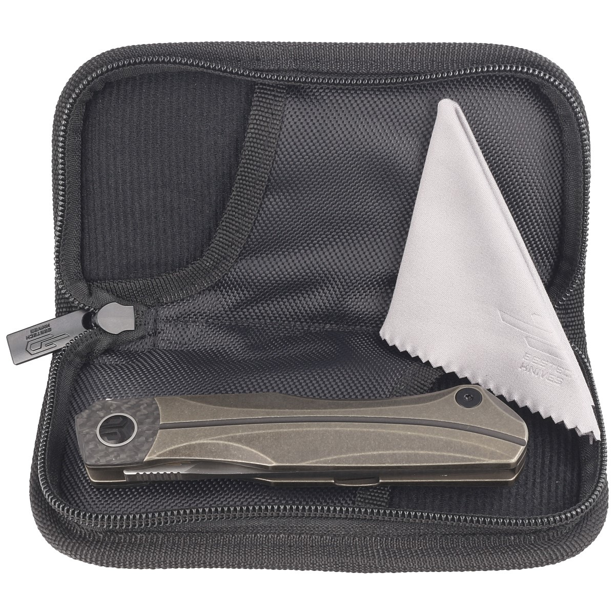Case - the knife is packed in a zippered nylon soft pouch with the brand's logo for safe carrying and storage of the folder.