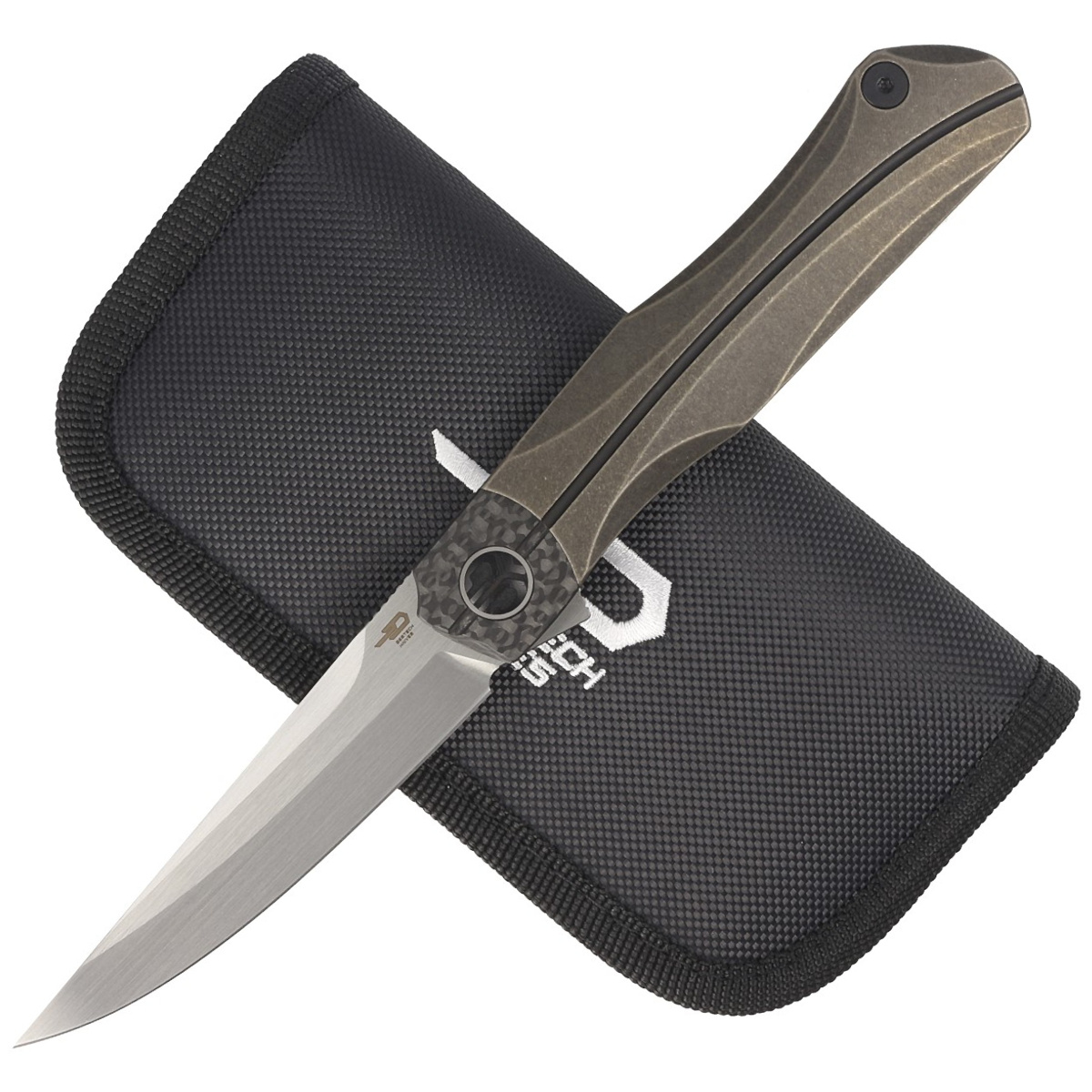 • Thyra Bronze Stonewashed Titanium/Carbon Fiber, Horizontal Satin large, elegant EDC folder for discerning buyers. Result of cooperation between Polish designer Grzegorz "Kombou" Grabarski and Bestech Knives. Artful handle, excellent blade steel!