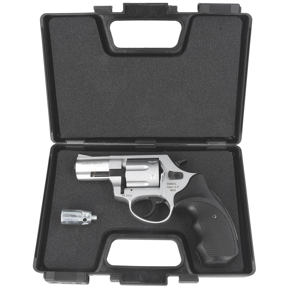 - EKOL Viper 2.5" .22L, silver alarm revolver for side-firing 6mm long caliber bang ammunition, will prove useful during self-defense by deterring potential attackers