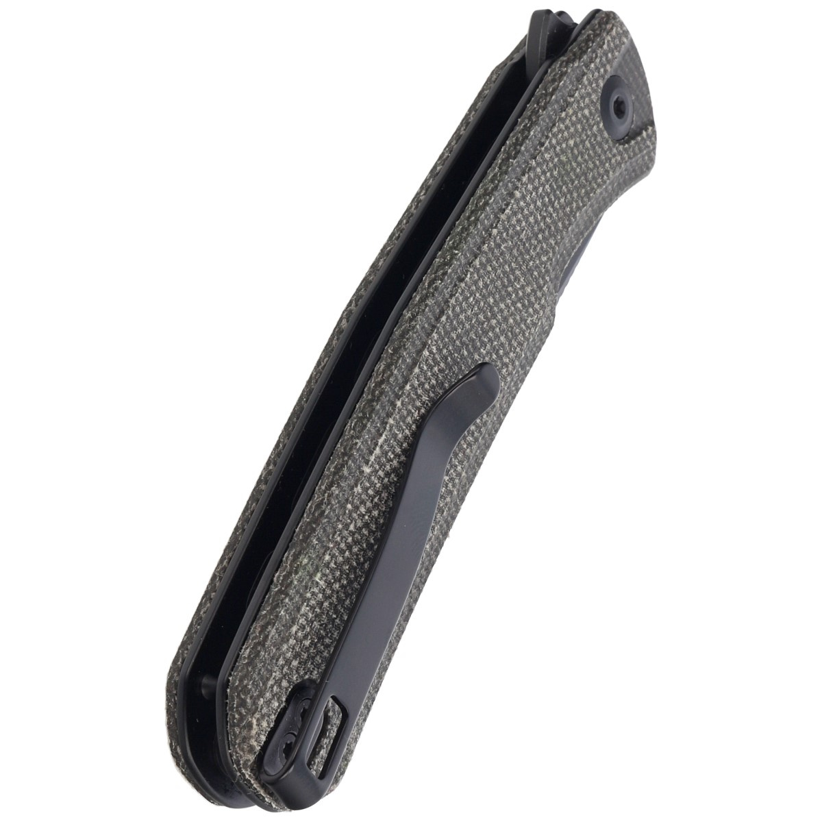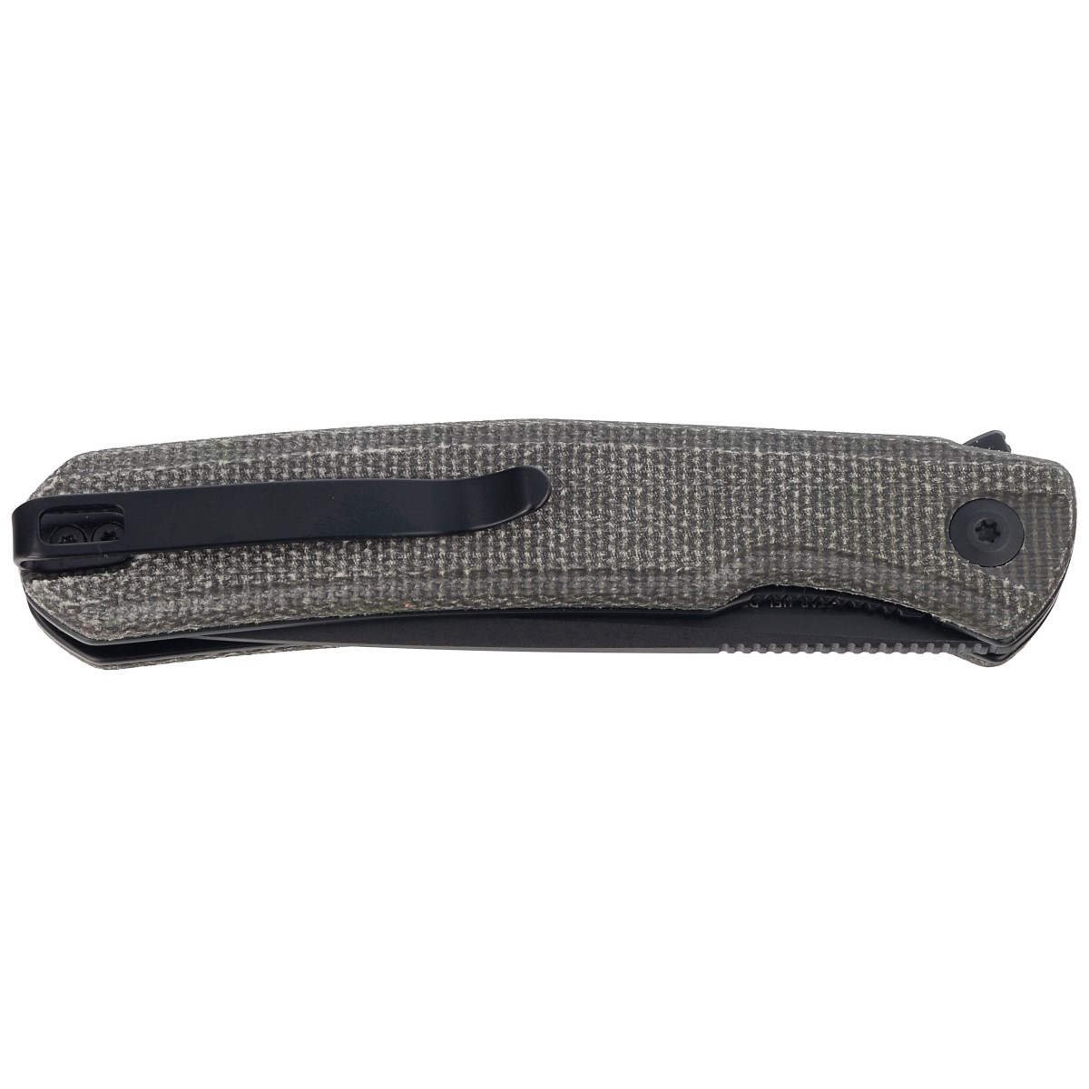Handle - made of Micarta, a composite material of pressure-pressed canvas with synthetic resin. The aggressive texture of the lining provides a secure grip, even with wet hands. The cover's chamfered edges eliminate sharp edges for comfort, and the jimping made in the front on the liners improves ergonomics. An open-backed design fixed with steel spacer sleeves reduces weight and makes cleaning easier. A two-position right/left deep carry clip allows you to carry the knife discreetly in your pocket in tip-up position (blade tip up).