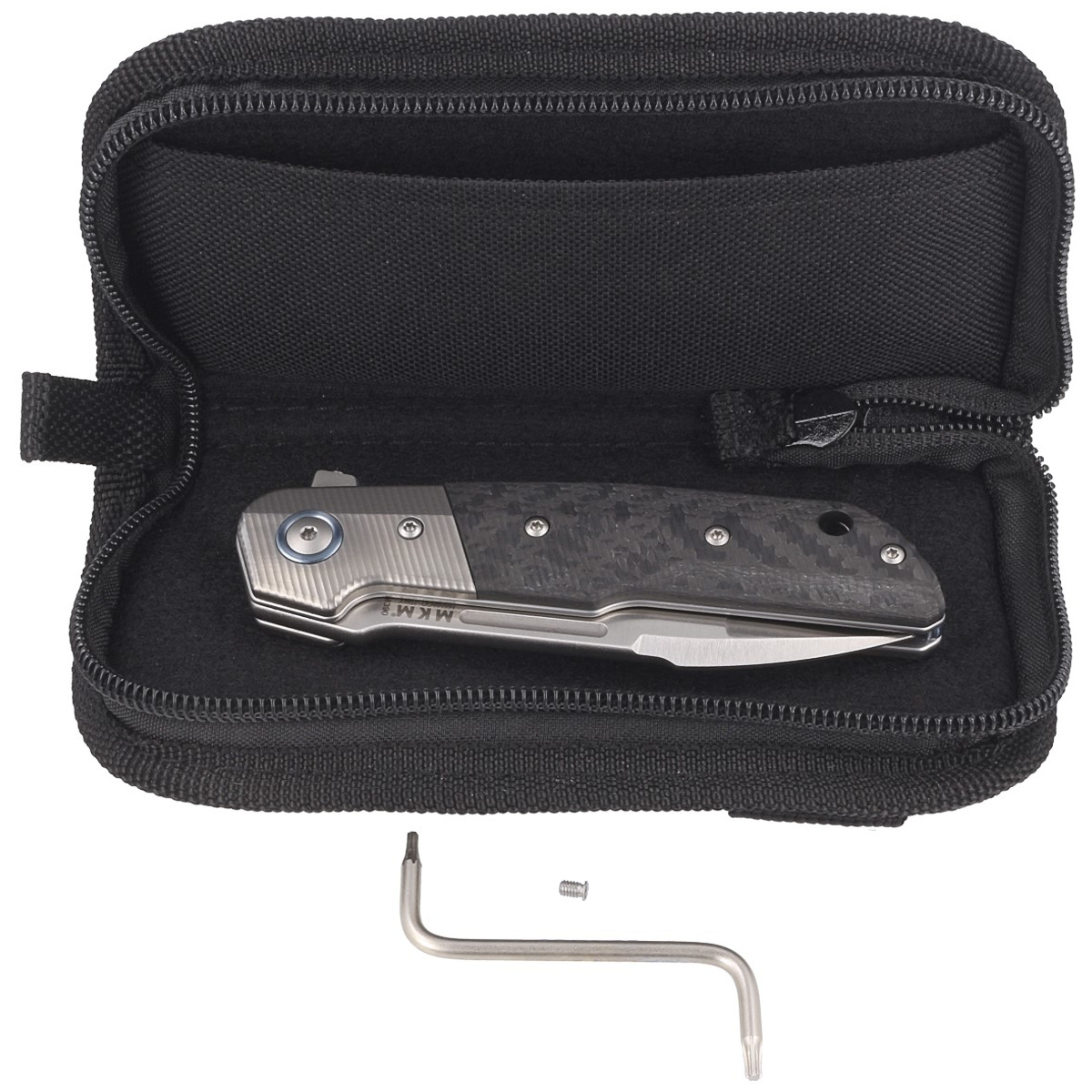 Handle - bolsters made of 6AL4V titanium, handle made of Carbon Fiber, carbon fiber compressed with synthetic resin. Chamfered edges of the covers eliminate sharp edges. The facings are screwed to an intricately machined titanium backspacer, giving assurance of many years of use. A single-position (right/left) deep-carry clip allows you to carry the knife discreetly in your pocket in the tip-up (blade tip up) position. In the back of the handle a hole for threading a safety or decorative cord.