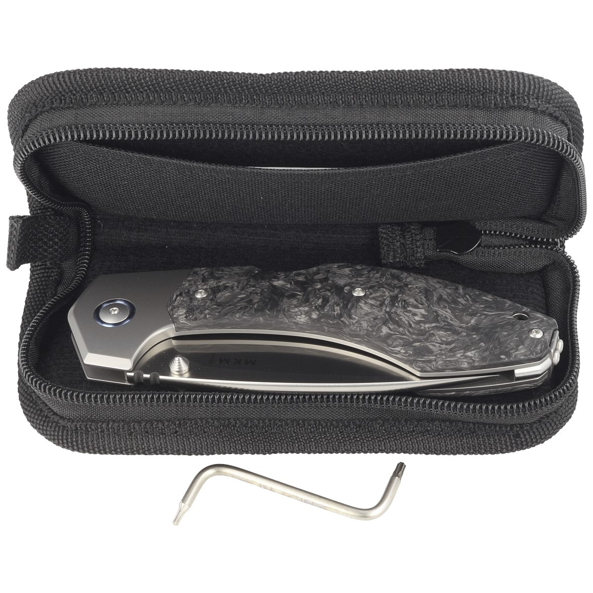 Handle - bolsters made of 6AL4V titanium, handle made of Marble Carbon Fiber, a carbon fiber with marble texture. Chamfered edges of the covers eliminate sharp edges. The facings are screwed to an intricately machined titanium backspacer, giving assurance of many years of use. A two-position (right/left) deep-carry clip allows you to carry the knife discreetly in your pocket in the tip-up (blade tip up) position. In the back of the handle a hole for threading a safety or decorative cord.