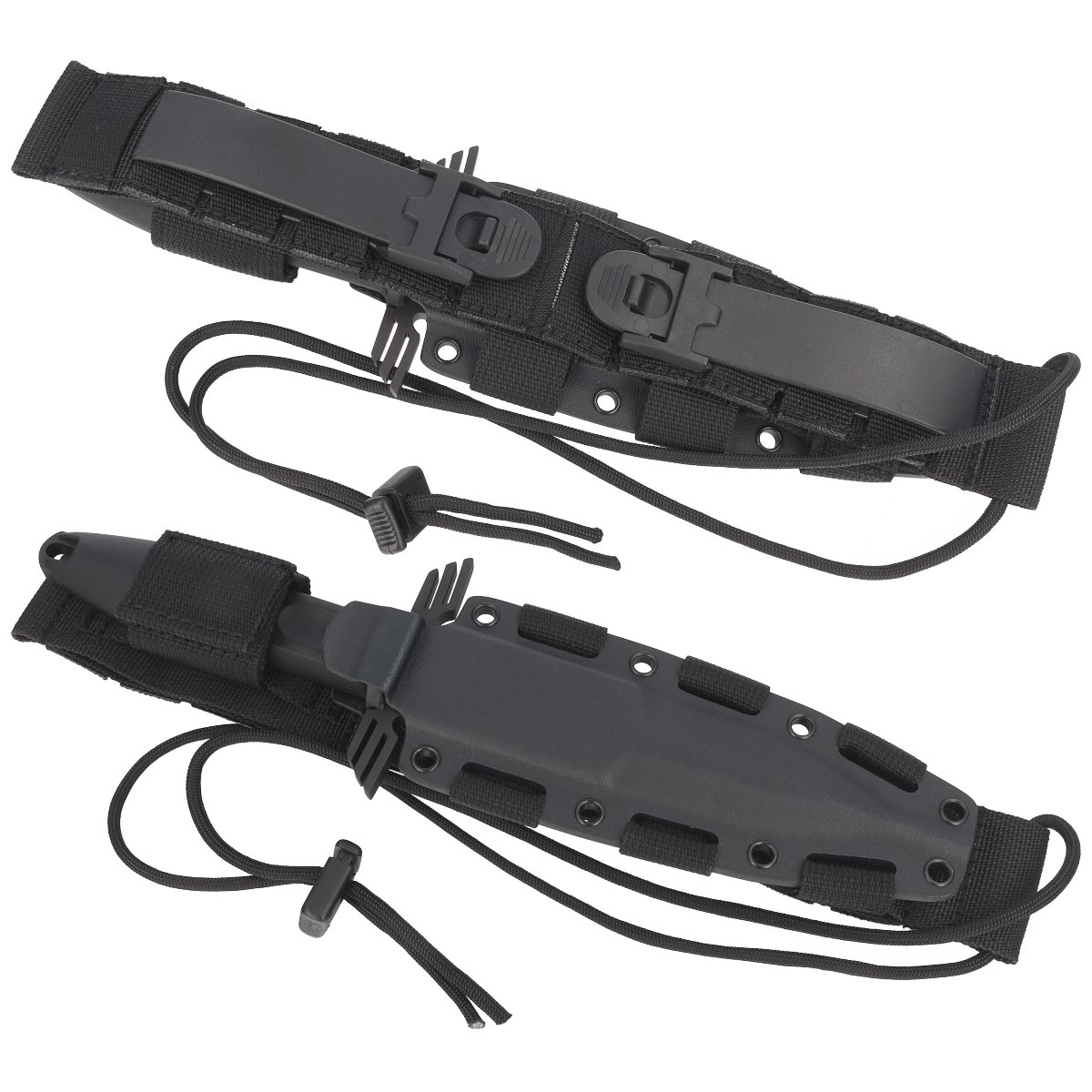 Sheath - made of Kydex and nylon fabric, in black allows you to safely carry and and quickly retrieve the knife. It can be carried on the belt, using the holes on the edges to attach the optional Tek-Lok type attachment, and the two included clips allow you to carry it clipped to the M.O.L.L.E. system.