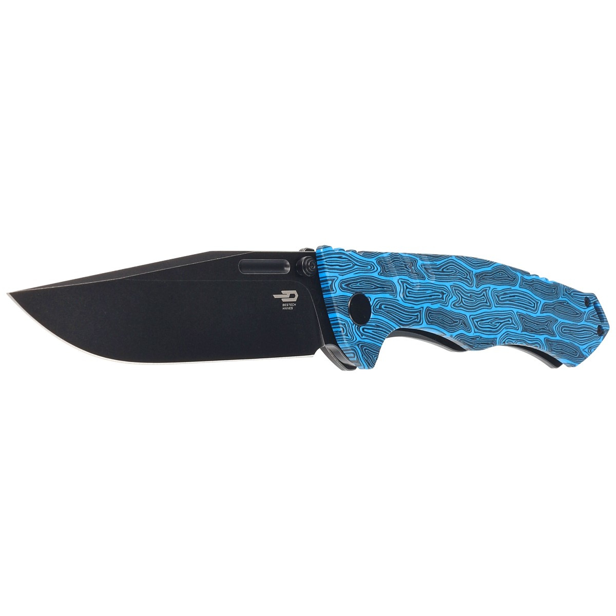Keen II Black Blue Damascus G10 / Titanium, Black Stonewashed, one of Bestech's flagship knives, designed by Morgan Koens. A large, extremely sturdy folder that will perform well in both EDC applications and heavier field work!