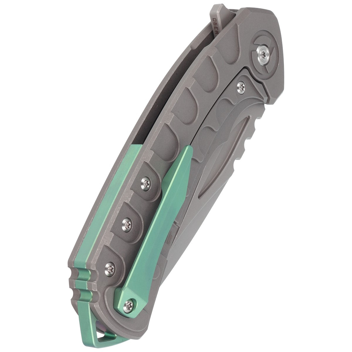 Handle - is two pieces of grey solid titanium 6AL4V. Chamfered edges of the covers eliminate sharp edges for comfort and improve grip security, additional decoration in the shape of crocodile scales. The solid backspacer to which the facings are attached guarantees the rigidity and strength of the entire structure. A single-position, right-handed titanium clip allows the knife to be carried in tip-up position, with the tip of the blade upward. The protruding part of the backspacer creates a hole for threading a belaying or decorative cord, and can also be used as a glass breaker.