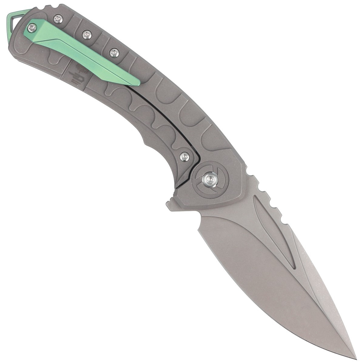 Buwaya Grey Titanium, Dark Bead Blast Stonewashed is a factory reissue of the custom folder of the same name, designed by Polish designer Grzegorz "Kombou" Grabarski and made by Rafal "Brrr..." Brzeski. Intricately decorated titanium handle, excellent blade steel, high quality workmanship by Bestech!!!
