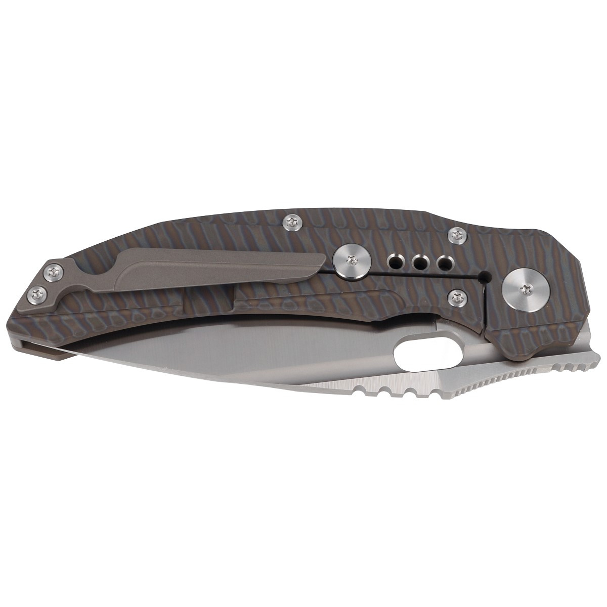 Handle - is two pieces of solid titanium 6AL4V colored in Tiger Stripes pattern.... Chamfered edges of the covers eliminate sharp edges for comfort and improve grip security. The solid titanium backspacer to which the grips are attached guarantees the rigidity and strength of the entire structure. The pivot axis decorated with the logo of the designers, Todd Knife and Tool. A single-position, right-handed titanium clip allows the knife to be carried in tip-up position, with the tip of the blade upward.