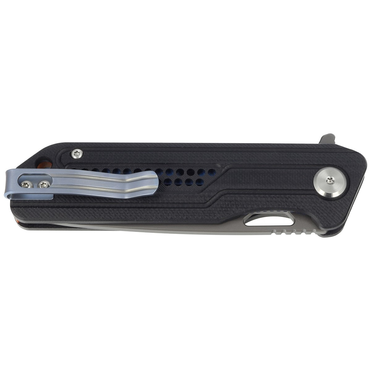 Handle - G10 liners, a plastic that is insensitive to weather conditions, resistant to chemicals and mechanical damage Chamfered edges of the covers eliminate sharp edges and textured surfaces improve grip security. A series of holes in the liner relieves stress on the knife. The solid backspacer to which the facings are attached guarantees the rigidity and strength of the entire structure. A single-position, right-handed titanium clip allows the knife to be carried in tip-up position, with the tip of the blade upward. Above the clip a hole for threading a safety or decorative cord.
