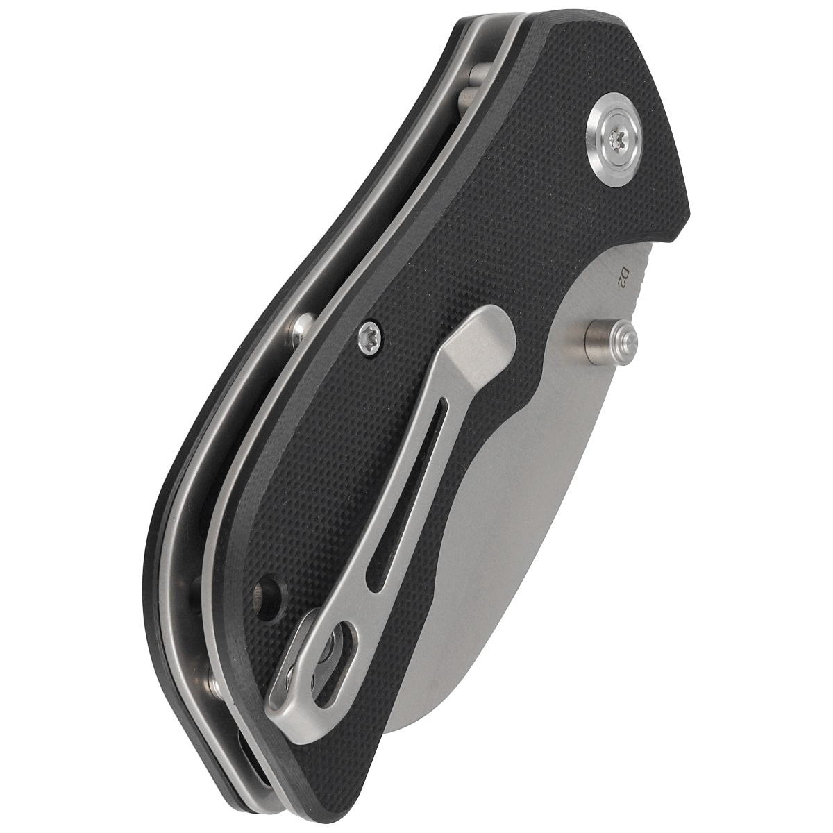 Handle - grips made of G10 (pressure-pressed fiberglass with synthetic resin), textured to improve grip confidence, bolted to the knife's steel frame. The so-called open-backed design without the typical backspacer, fastened together with steel spacers for easy cleaning. The simple, sturdy design gives assurance of many years of use. A deep finger undercut (fore finger groove) improves grip security. The pivot axis is decorated with a stylized manufacturer's logo. A two-position (right/left) steel deep-carry clip allows you to carry the knife discreetly in your pocket in tip-up position (blade tip up). Above the clip a lanyard hole, a hole for threading a safety or decorative cord.