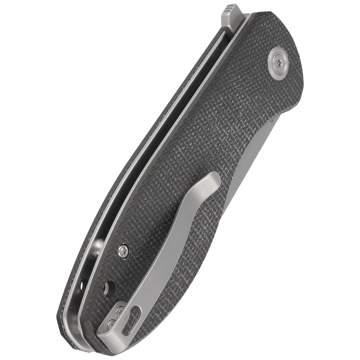 Handle - Micarta facings (pressure-pressed canvas with synthetic resin). Textured to improve grip confidence, screwed to the steel frame of the knife. The so-called open-backed design without the typical backspacer, fastened together with steel spacers for easy cleaning. The simple, sturdy design gives assurance of many years of use. Two-position (right/left) steel deep-carry clip allows you to carry the knife discreetly in your pocket in tip-up position (blade tip up). Above the clip a lanyard hole, a hole for threading a safety or decorative cord.