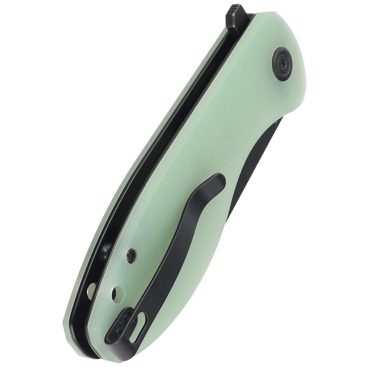Handle - G10 (pressure-pressed fiberglass with synthetic resin) facings. Textured to improve grip confidence, bolted to the knife's steel frame. The so-called open-backed design without the typical backspacer, fastened together with steel spacers for easy cleaning. The simple, sturdy design gives assurance of many years of use. Two-position (right/left) steel deep-carry clip allows you to carry the knife discreetly in your pocket in tip-up position (blade tip up). Above the clip a lanyard hole, a hole for threading a safety or decorative cord.