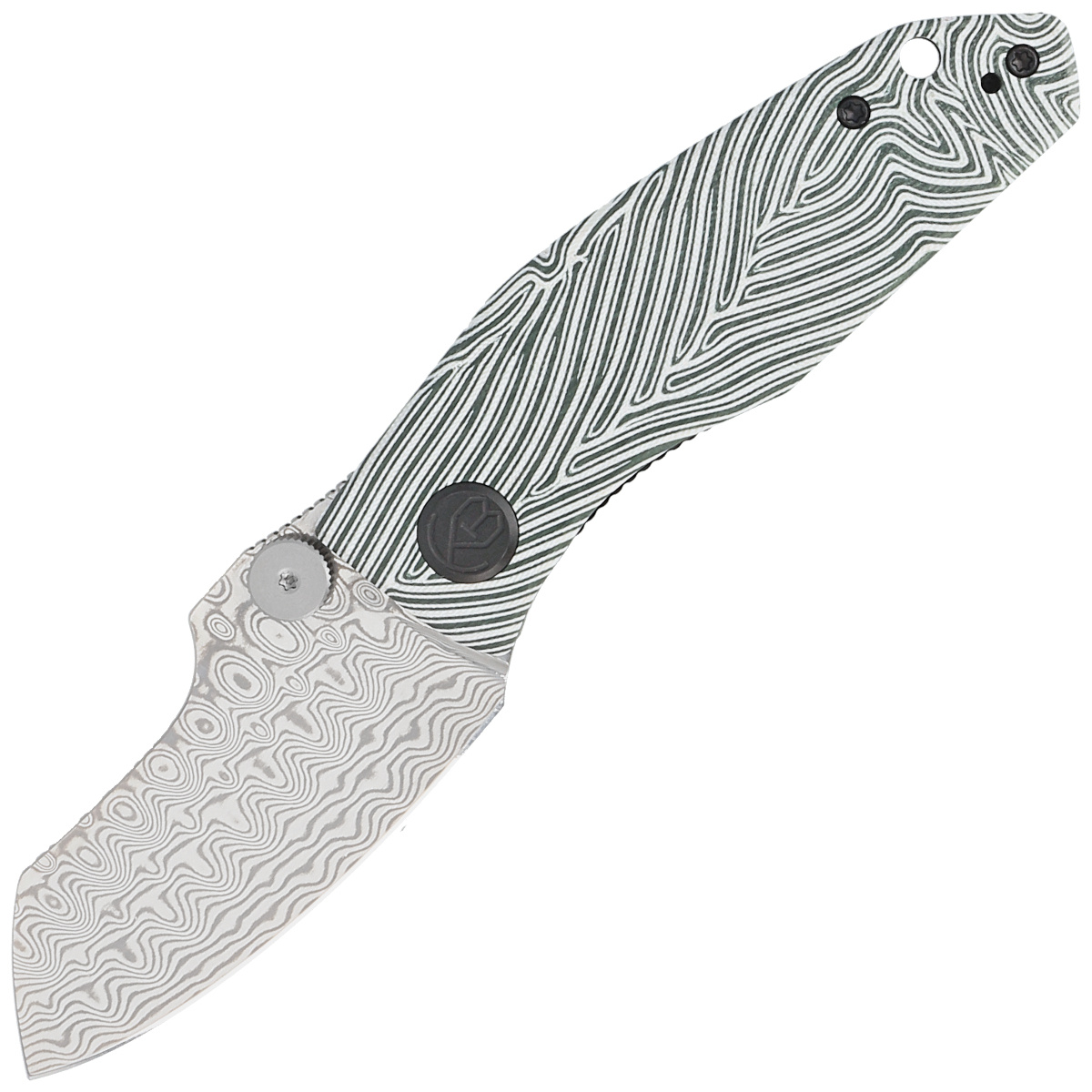 - Monsterdog White/Green G10, Damascus, compact EDC folder, small in size, yet built like a tank! Beautiful and hard damascus on the blade, rugged G10 plastic on the handle, a tool you can always carry with you and that will not disappoint!