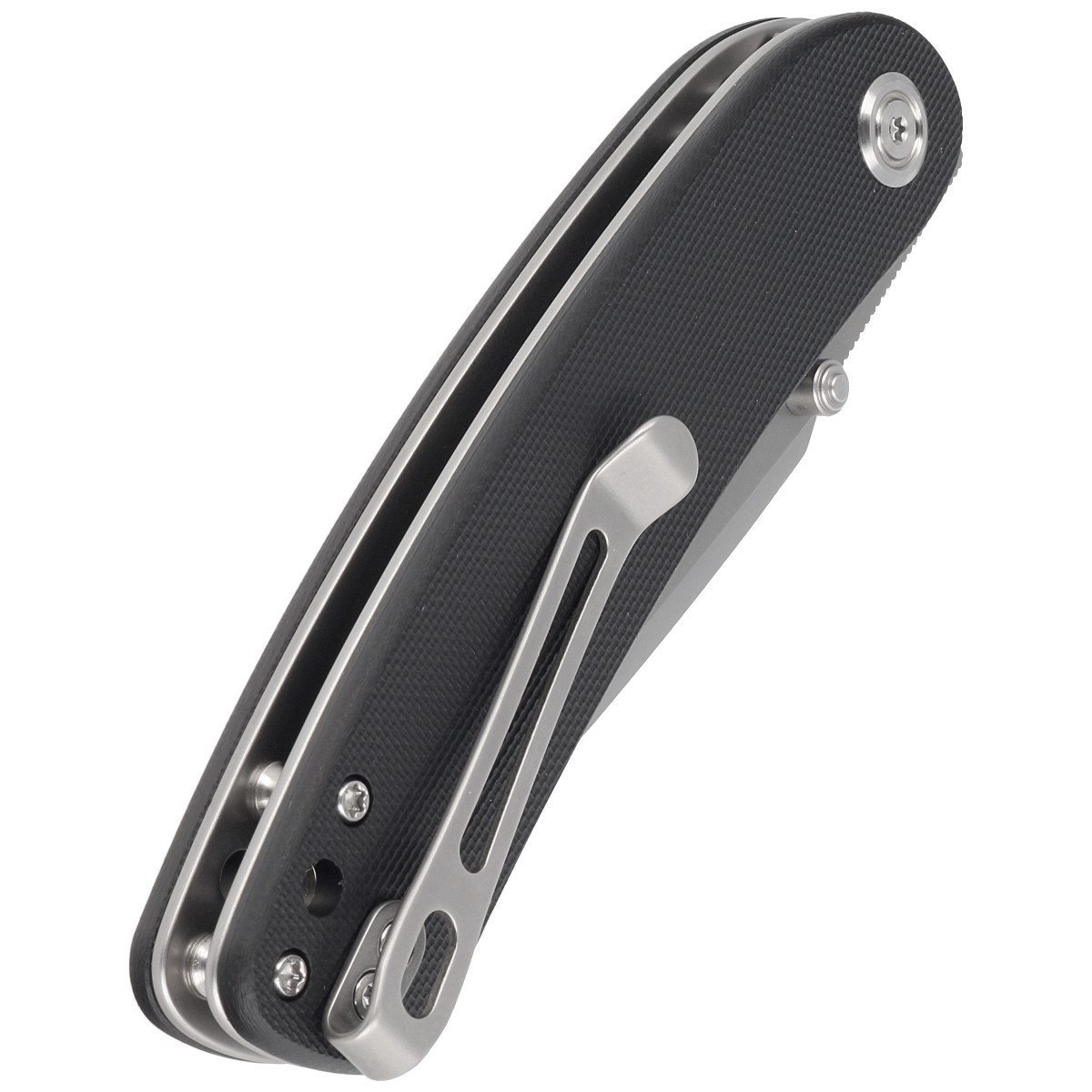 Handle - black G10 (pressure-pressed fiberglass with synthetic resin) facings, textured to improve grip confidence, bolted to the knife's steel frame. The so-called open-backed design without the typical backspacer, fastened together with steel spacers for easy cleaning. The simple, sturdy design gives assurance of many years of use. Two-position (right/left) steel deep-carry clip allows you to carry the knife discreetly in your pocket in tip-up position (blade tip up). Above the clip a lanyard hole, a hole for threading a safety or decorative cord.