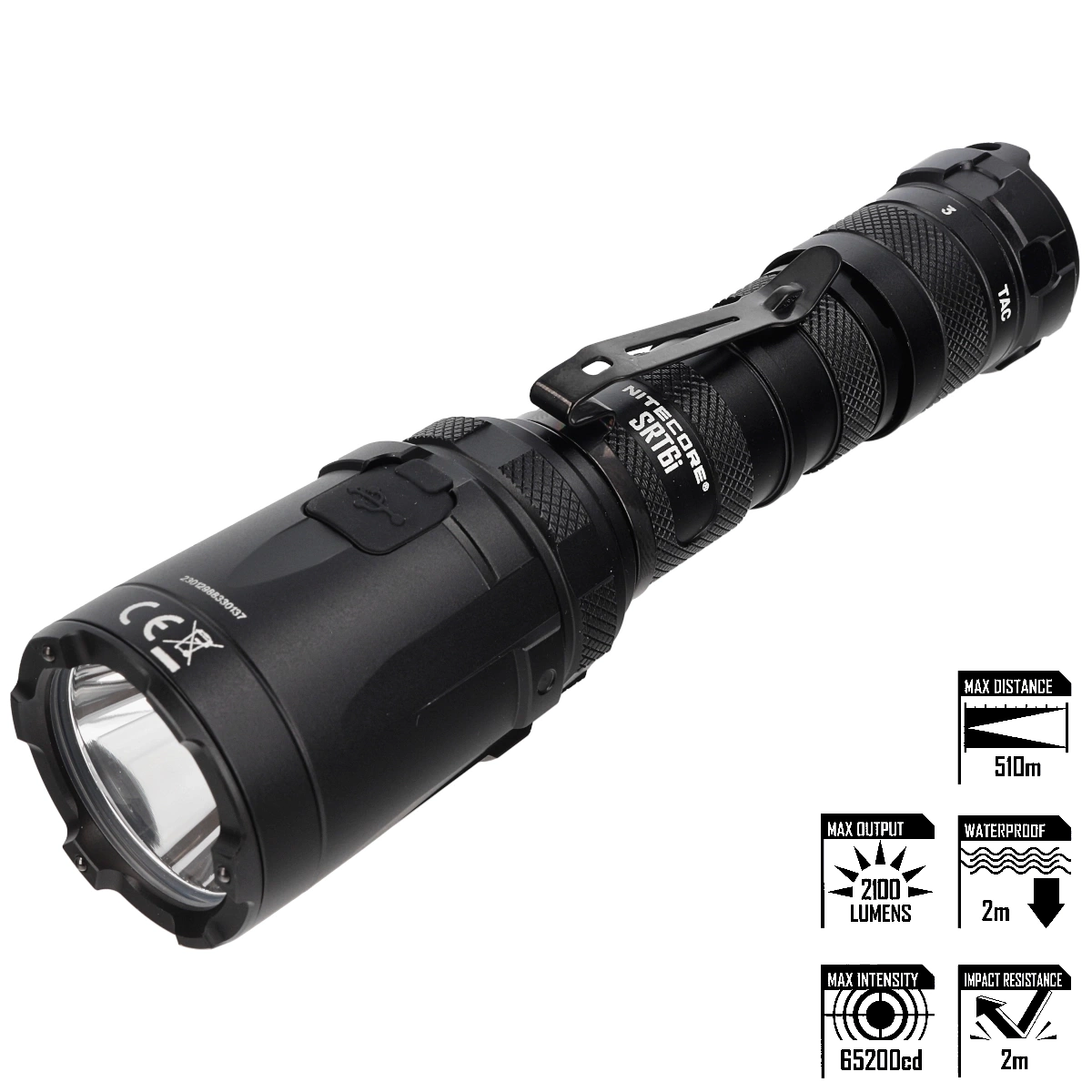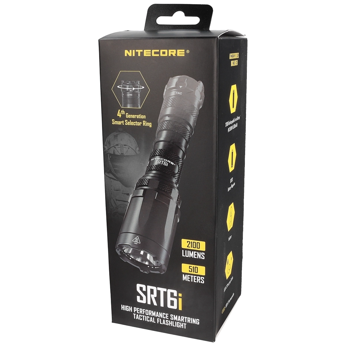 - NiteCore SRT6i Tactical Flashlight combines efficiency with Smart Selector Ring for easy use and precise control. The high-efficiency LED produces a maximum of 2100 lumens and achieves more than 510 meters of light output.