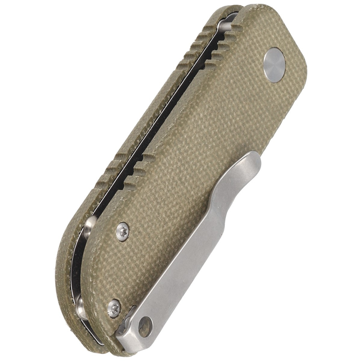 Handle - grips made of Micarta, a virtually indestructible plastic that is insensitive to weather conditions, resistant to chemicals and mechanical damage. Chamfered edges of the covers eliminate sharp edges and textured surfaces improve grip security. The so-called open-backed design without the typical backspacer, fastened together with steel spacer sleeves for easy cleaning. The simple, secure design provides confidence for years of use. Two-position (right/left) metal deep-carry clip allows you to carry the knife discreetly in your pocket in tip-up position (blade tip up).