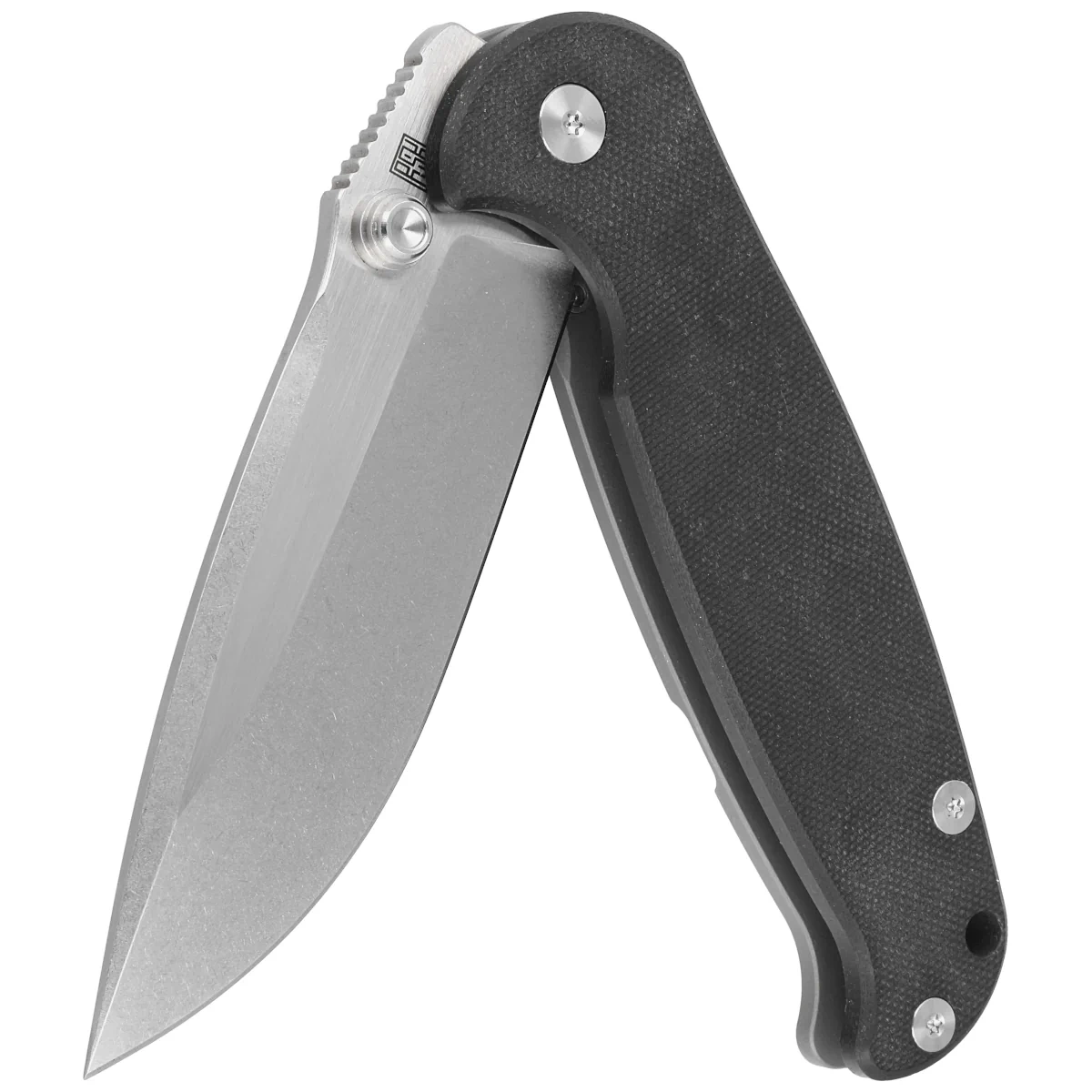 Handle - on the presentation side, the grips are made of G-10 composite (pressure-pressed fiberglass with synthetic resin) covered with fine texture. On the lock side, solid titanium. The grips are screwed to a solid backspacer, further stiffening the entire structure. The simple, solid construction gives the assurance of many years of use. The deep-carry, single-position (right) clip allows the knife to be carried in tip-up position. Above the clip a lanyard hole, a hole for threading a safety or decorative cord,