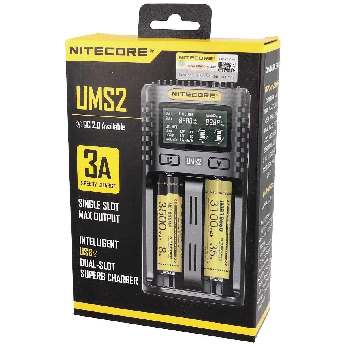 - The Nitecore UMS2 is a high-tech USB charger for lithium-ion batteries. Offering compatibility with a wider range of batteries, this convenient charger can be used with large-size batteries, including 20700 and 21700 cells.