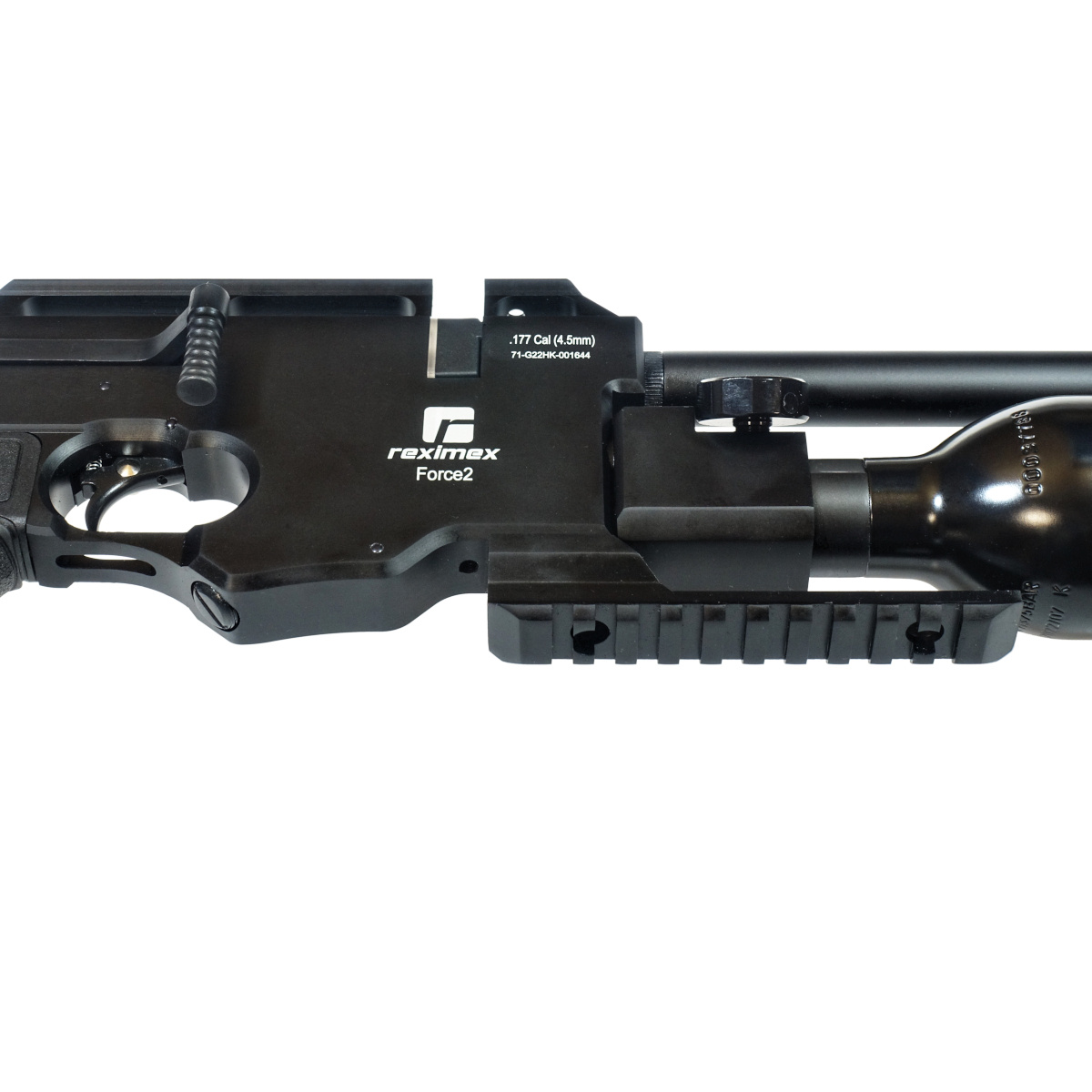 • Reximex Force2, a state-of-the-art PCP air rifle in a practical tactical stock with pistol grip, telescopic flask, and movable foot and cheekbone. Available in calibers: .177 (4.5 mm), .22 (5.5 mm), .25 (6.35 mm)