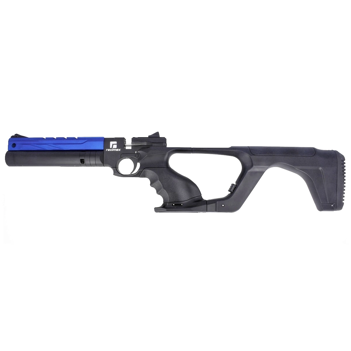 • Reximex RP Blue, a sporty PCP pistol with a regulator for repeatable shots. Adjustable pin barrel and trigger tongue. Pressure vessel with a capacity of. 50cc. Anatomical handle with shelf with flask attachment option. Cal. 4.5mm, 5.5mm