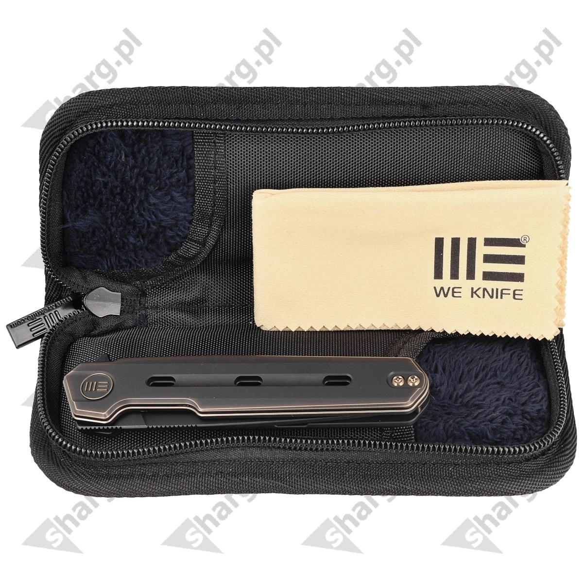 Handle - grips made of titanium 6AL4V. Chamfered edges of the coverings eliminate sharp edges. The grips are screwed to an intricately machined titanium backspacer, giving the assurance of many years of use. The pivot axis is decorated with a stylized WE Knife brand logo. A two-position (right/left) titanium deep-carry clip allows you to carry the knife discreetly in your pocket in the tip-up (blade tip up) position. On the back of the Handle a lanyard hole, hidden in the backspacer, a place for a decorative or safety line.