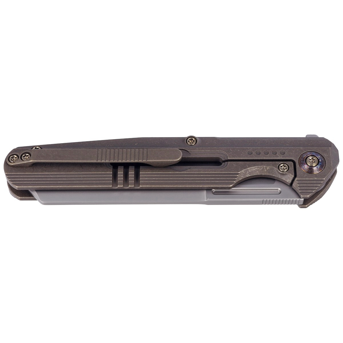 Handle - is thick pieces of titanium 6AL4V, beautifully milled in geometric patterns. Only a few companies are able to make the Handle with such incredible accuracy! Joined together using a titanium backspacer. The simplicity and solidity of the construction give the assurance of many years of use. The single-position clip (right), made of titanium, allows the knife to be carried in tip-up position. As in other models, the pivot axis is decorated with a stylized logo of the manufacturer.