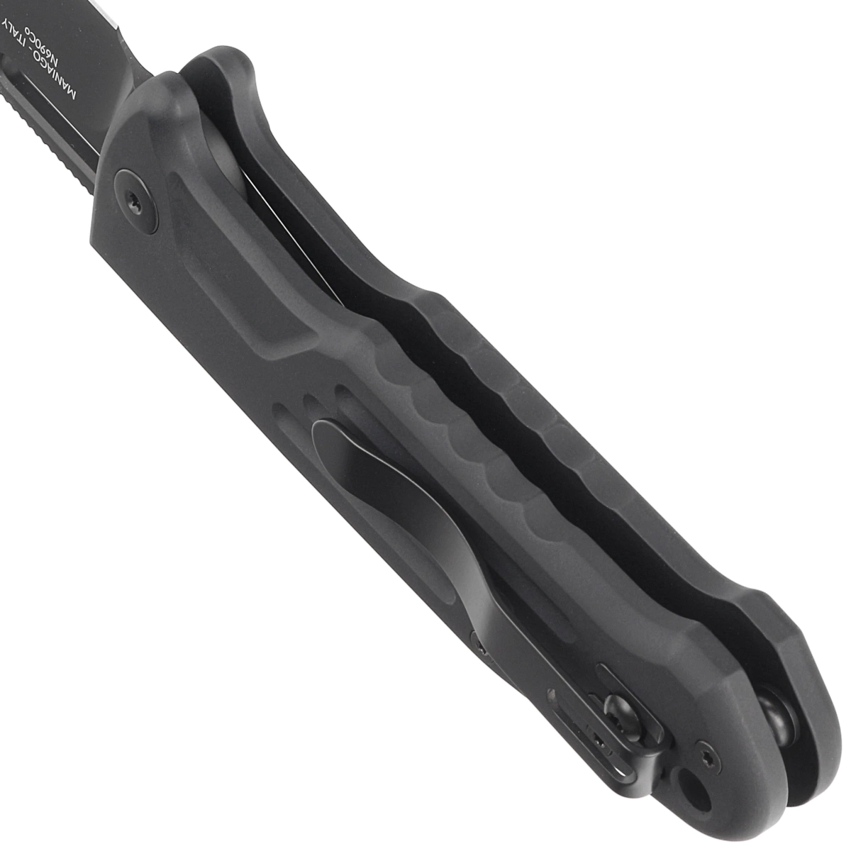 New Smarty Clip Point Black Anodized Aluminum, Black PVD is a automatic knife (Switchblade) designed by Stefano De Lorenzi. Featuring an extremely durable construction, equipped with a robust lock that turns the folder into a fixed-blade knife. Made with N690Co stainless steel and a strong aluminum handle. Bestseller!