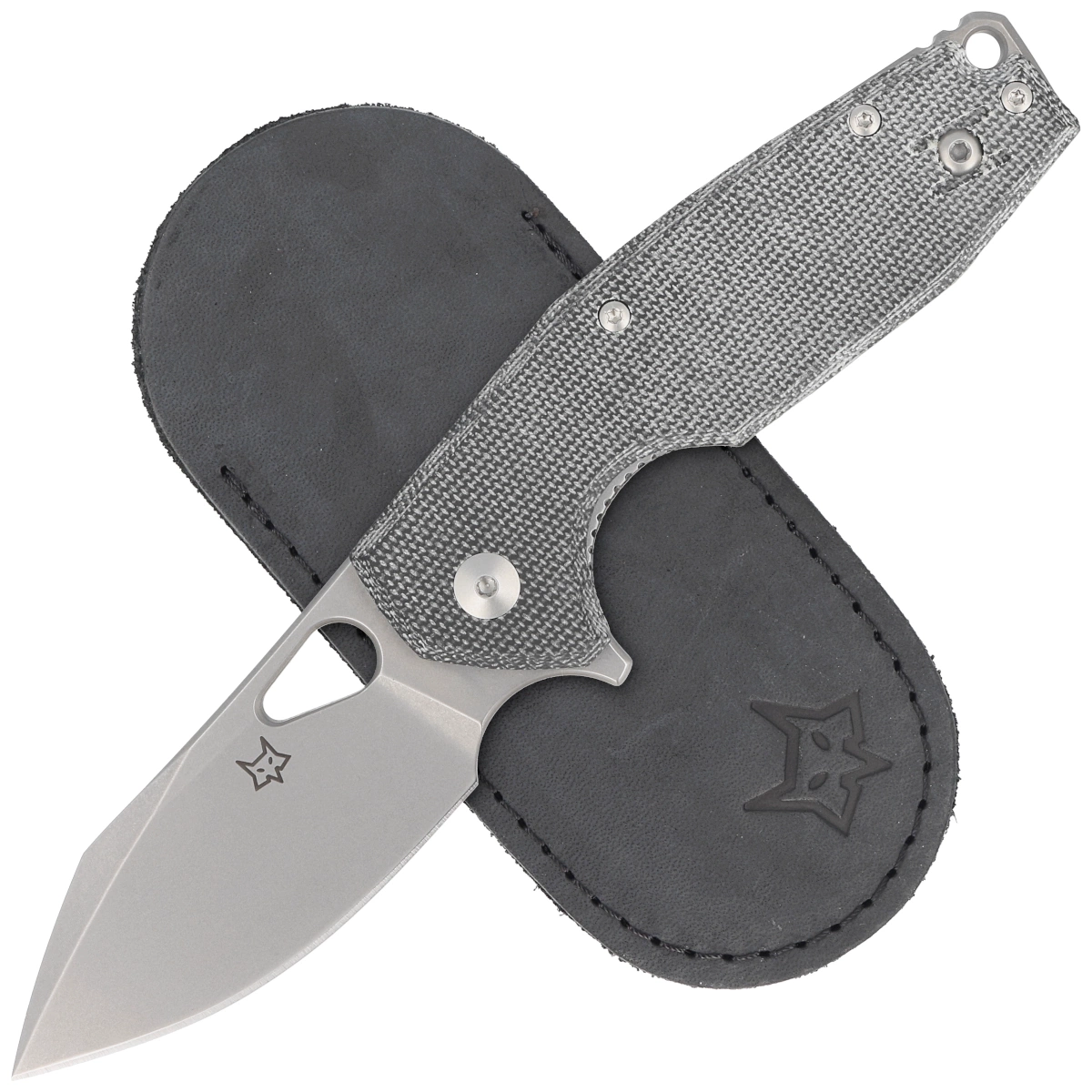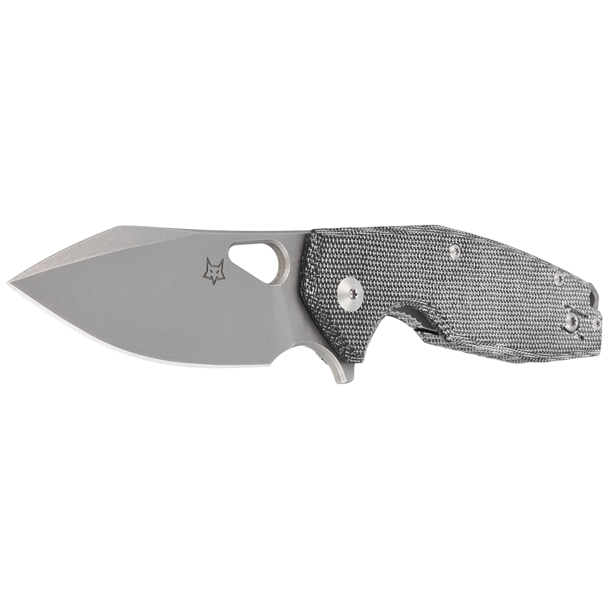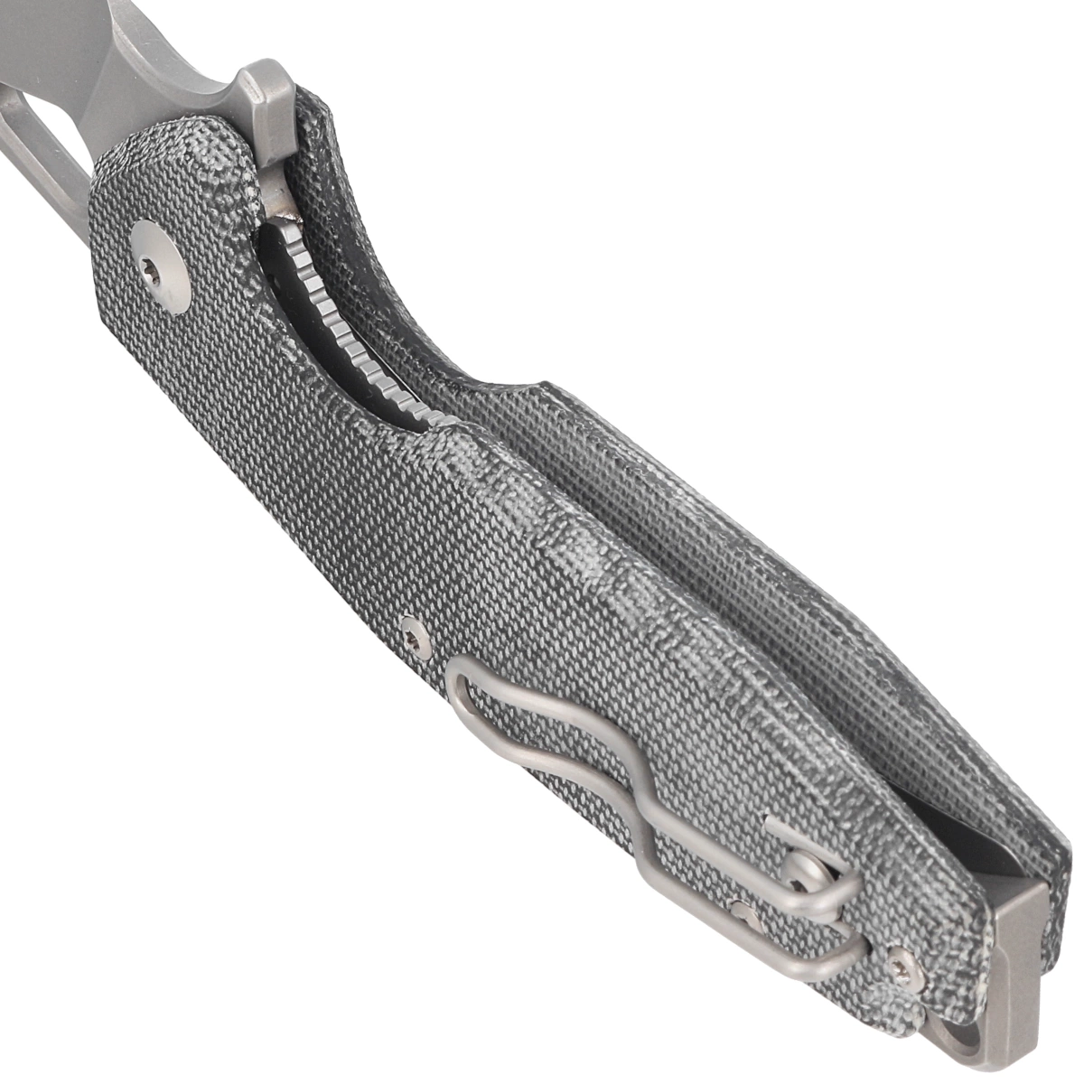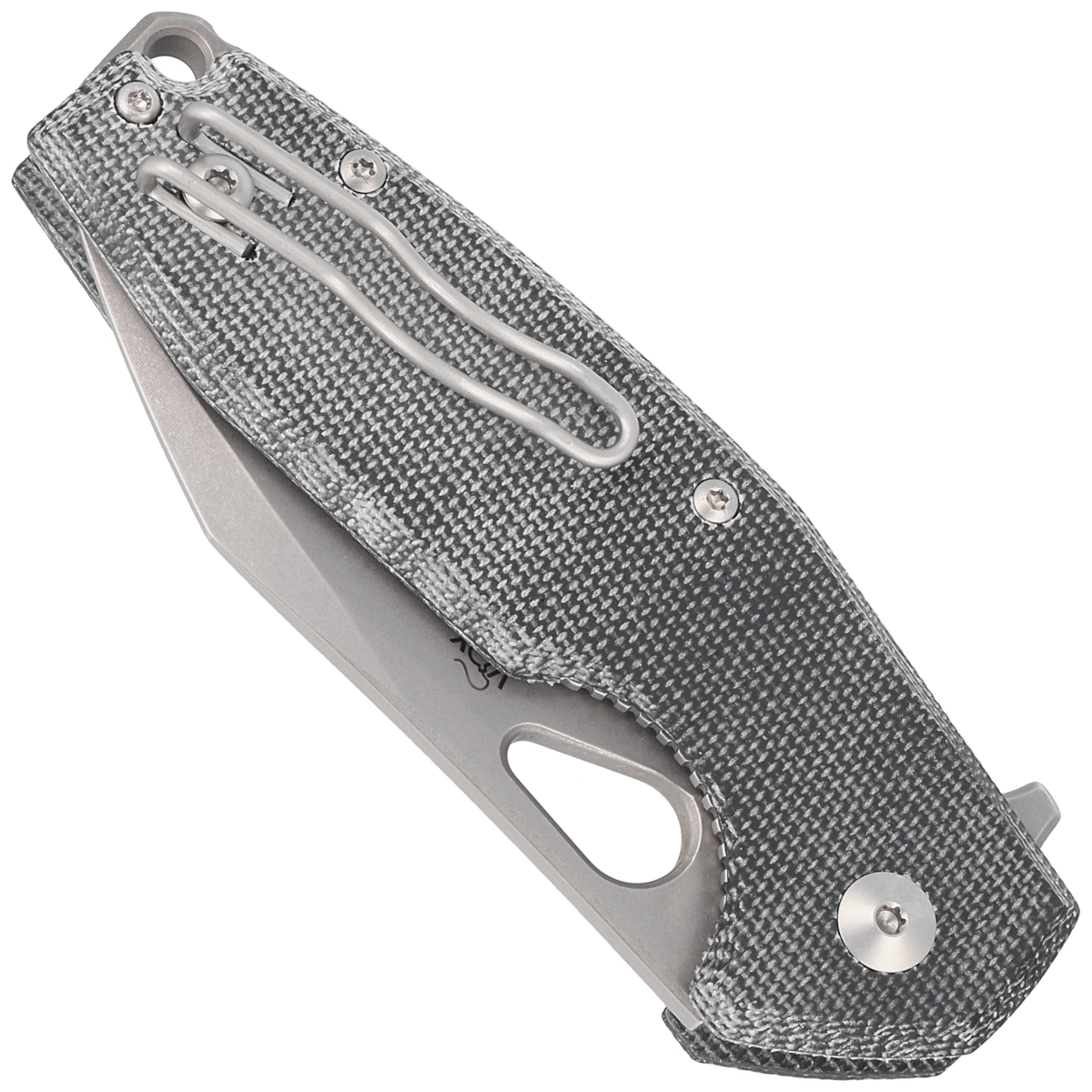 Handle - grips made of Micarta (pressure-pressed canvas with synthetic resin) insensitive to weather conditions, resistant to mechanical damage. Chamfered cover edges eliminate sharp edges for comfortable grip. Gray oxidized backspacer provides rigidity and sturdiness to the overall design. A two-position (right/left) lightweight wire clip allows the knife to be carried in the tip-up position, with the tip of the blade upward. Above the clip a hole for threading a safety or decorative cord.
