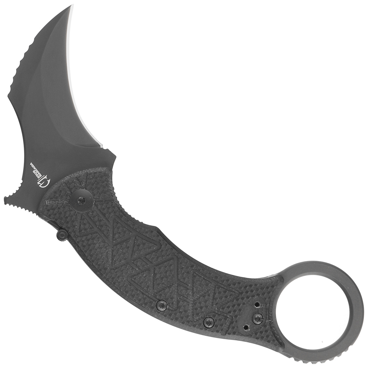 Tribal K Black G10, Black Top Shield modern folding karambit designed by Doug Marcaida, a master of Filipino martial arts. Many years of experience with knives of this type have been poured into this design, full of useful solutions. N690Co steel blade with black Top Shield® coating, grooved finger ring, G10 grips, a tool that will not disappoint!