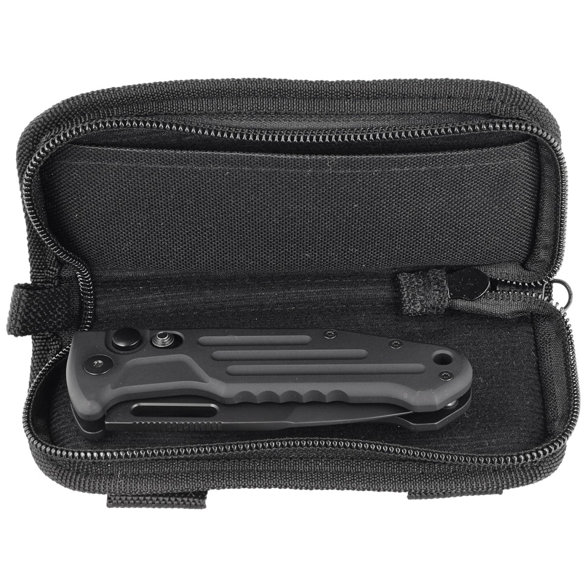 Case - the knife is packed in a zippered soft nylon case. It is used for safe storage and transportation of the folder.