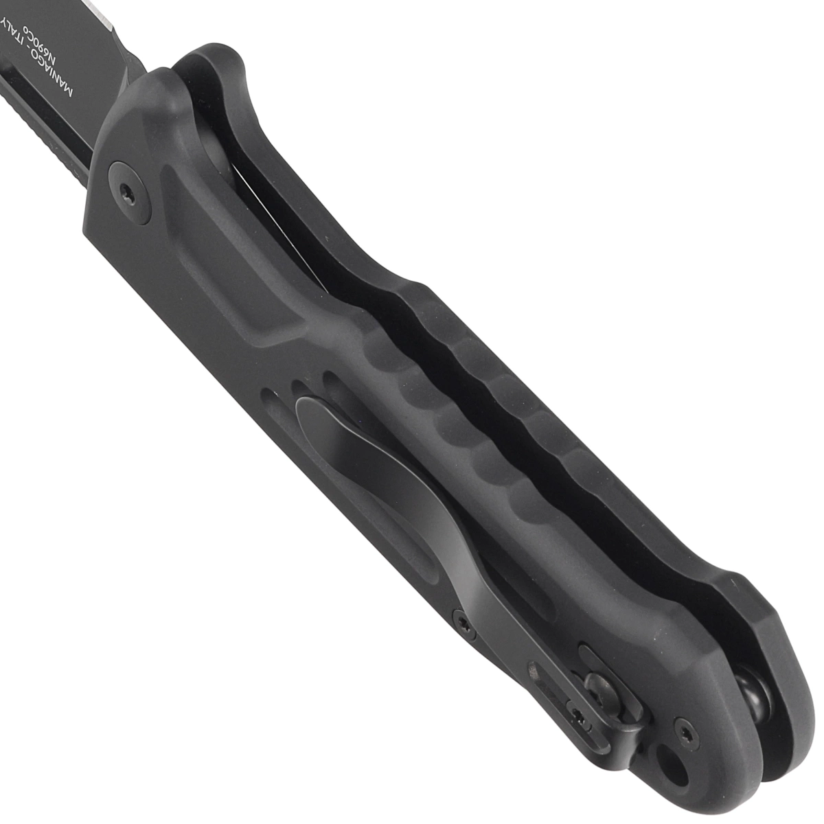 Handle - in black. Made of textured aluminum, whose beveled edges of the covers eliminate sharp edges for comfort, and the fore finger groove made on the front improves grip security. Next to the opening button is a locking slider, allowing you to block the possibility of accidental opening. A single-position (right) deep-carry clip allows you to carry the knife discreetly in your pocket in tip-up position (blade tip up).
