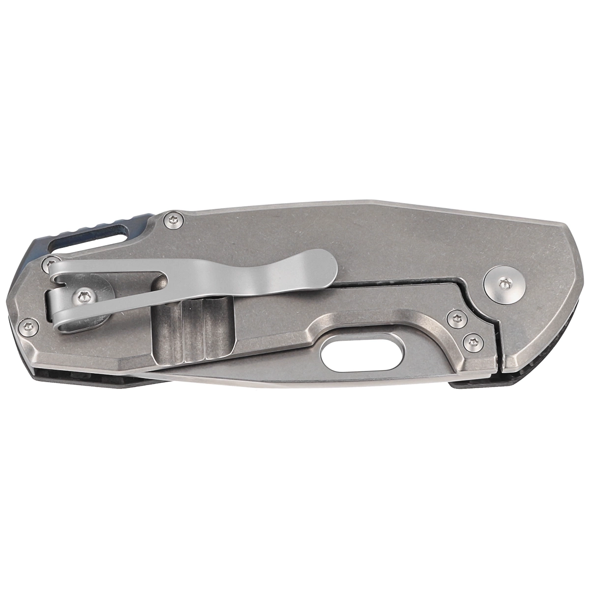 Handle - on one side a thick piece of black Carbon Fiber (carbon fiber compressed under pressure with synthetic resin), and on the other a solid titanium grip. The covers were bolted to a CNC-milled blue anodized titanium backspacer, which translates into the virtually indestructible nature of such a design. A right- and left-handed, two-position deep carry clip allows the knife to be carried discreetly in the tip-up (blade tip up) position. At the end of the Handle lanyard hole, a hole for a rope.