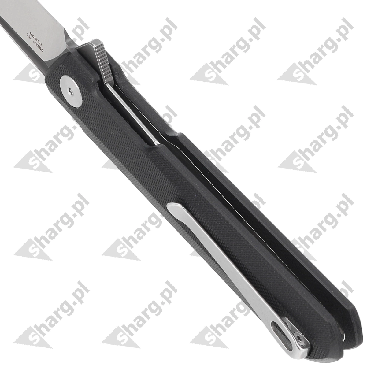 Handle - made of G10, a composite fiberglass material compressed with synthetic resin. The aggressive texture of the grips provides a firm grip, even with wet hands. The cover's chamfered edges eliminate sharp edges for comfort, and the finger indentation made on the front improves ergonomics. The open-backed design fixed with steel spacer sleeves reduces weight and makes cleaning easier. A two-position right/left deep carry clip allows you to carry the knife discreetly in your pocket in tip-up position (blade tip up).