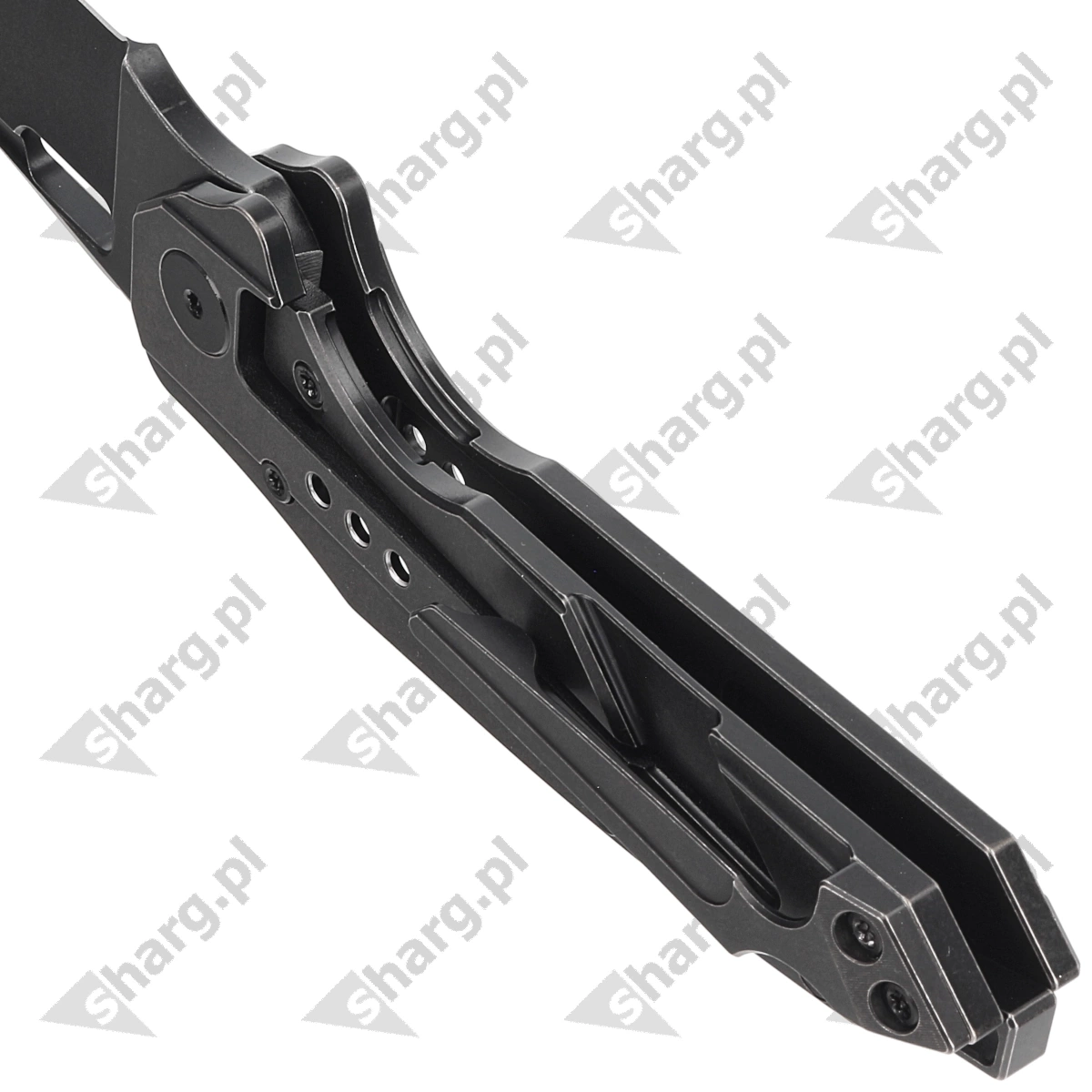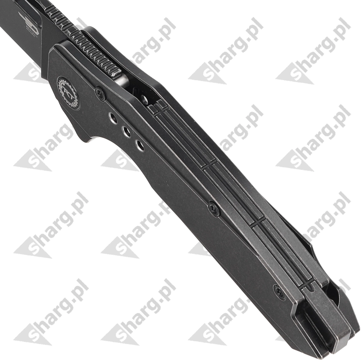 Blade - wide, Reverse Tanto type with a scratch-masking Stonewashed finish, followed by a black coating. The gentle curve of the cutting edge converges toward the needle-sharp tip of the knife. The thickness of the blade provides high strength while the high, flat grind gives excellent cutting edge geometry and extreme cutting performance. Additional reinforcement is provided by the long grain. Ball bearing ceramic supports the opening of the blade with a fast front flipper (index-finger front flipper). We can also open the knife using a hole in the wedge (thumb hole). The whole thing is locked with a proven and popular frame lock with a steel insert to prevent wiping of the lock face.
