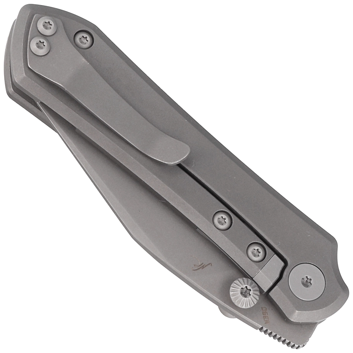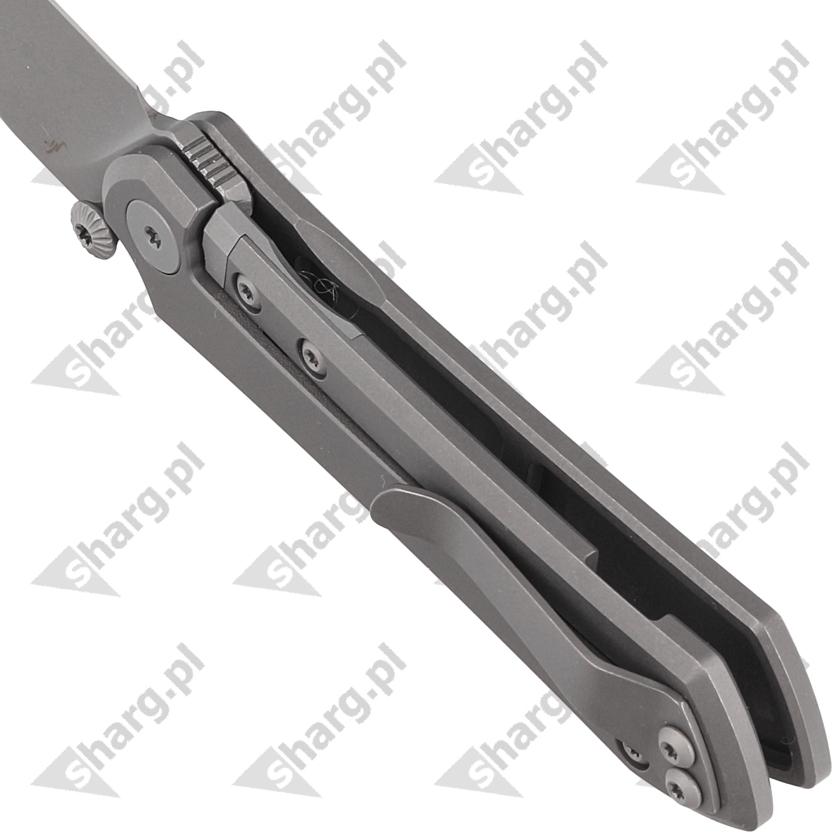Handle - is two pieces of solid 6AL4V titanium finished in Dark Stonewashed. Ergonomically profiled, eliminate sharp edges for comfort, notches made in the grips improve grip security. Open-backed design without the typical backspacer, fastened together with steel spacer sleeves for easy cleaning. A single-position, right-handed titanium clip allows the knife to be carried in the tip-up position, with the tip of the blade upward.