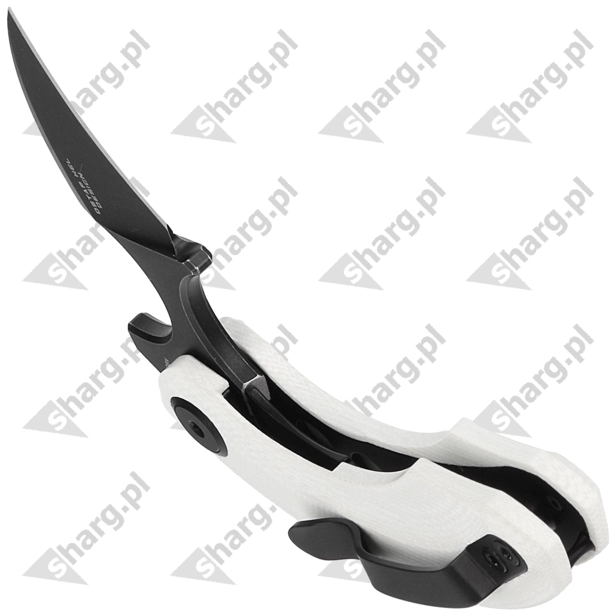 Handle - is two pieces of white G10, a plastic that is formed from compression of fiberglass with synthetic resin. The chamfered edges of the covers eliminate sharp edges for comfort, and the fore finger groove improves grip security. Open-backed design attached with spacer sleeves reduces weight and makes cleaning easier. A single-position, right-handed clip allows the knife to be carried in the tip-up position, with the tip of the blade upward.