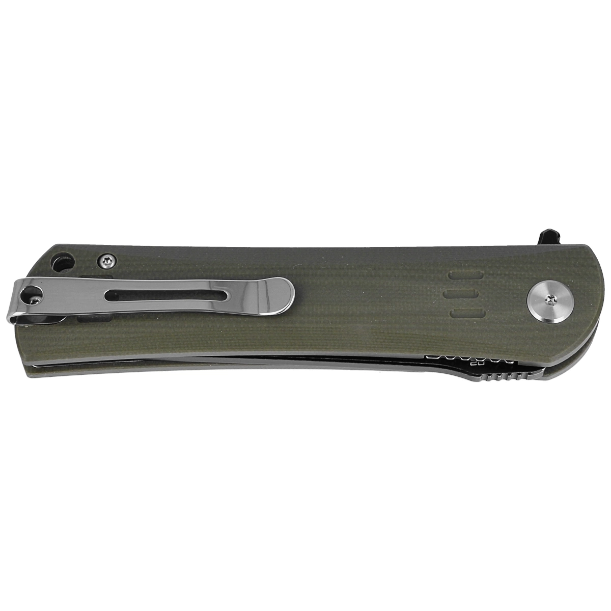 Handle grips - made of G10, a plastic insensitive to weather conditions, resistant to chemicals and mechanical damage Chamfered edges of the covers eliminate sharp edges and textured surfaces improve grip security. The backspacer to which the grips are attached guarantees the rigidity and strength of the entire structure. A single-position, right-handed clip allows the knife to be carried in tip-up position, with the tip of the blade upward.